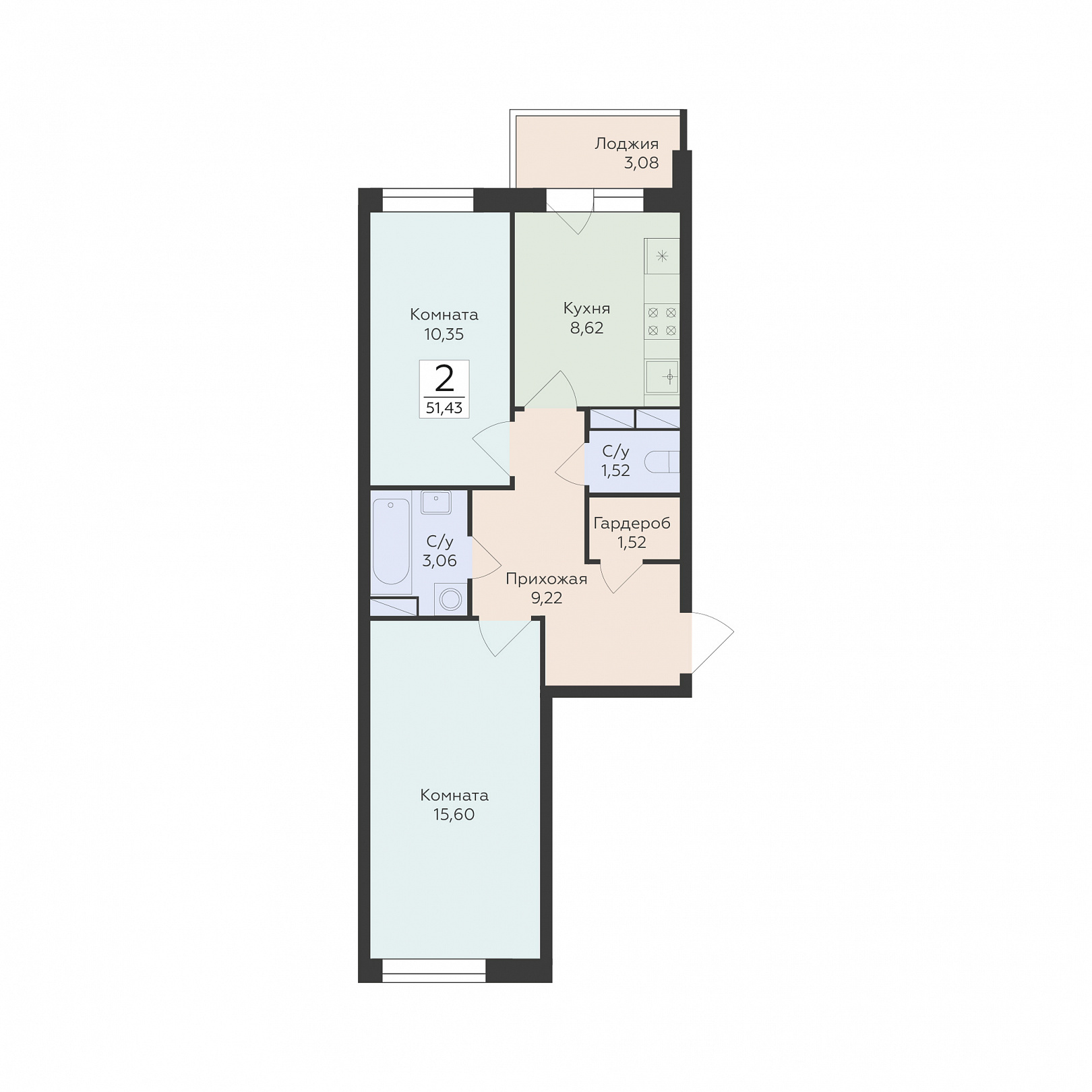 2-комнатная квартира, 51.43 м2, 3 этаж, №416, Flora