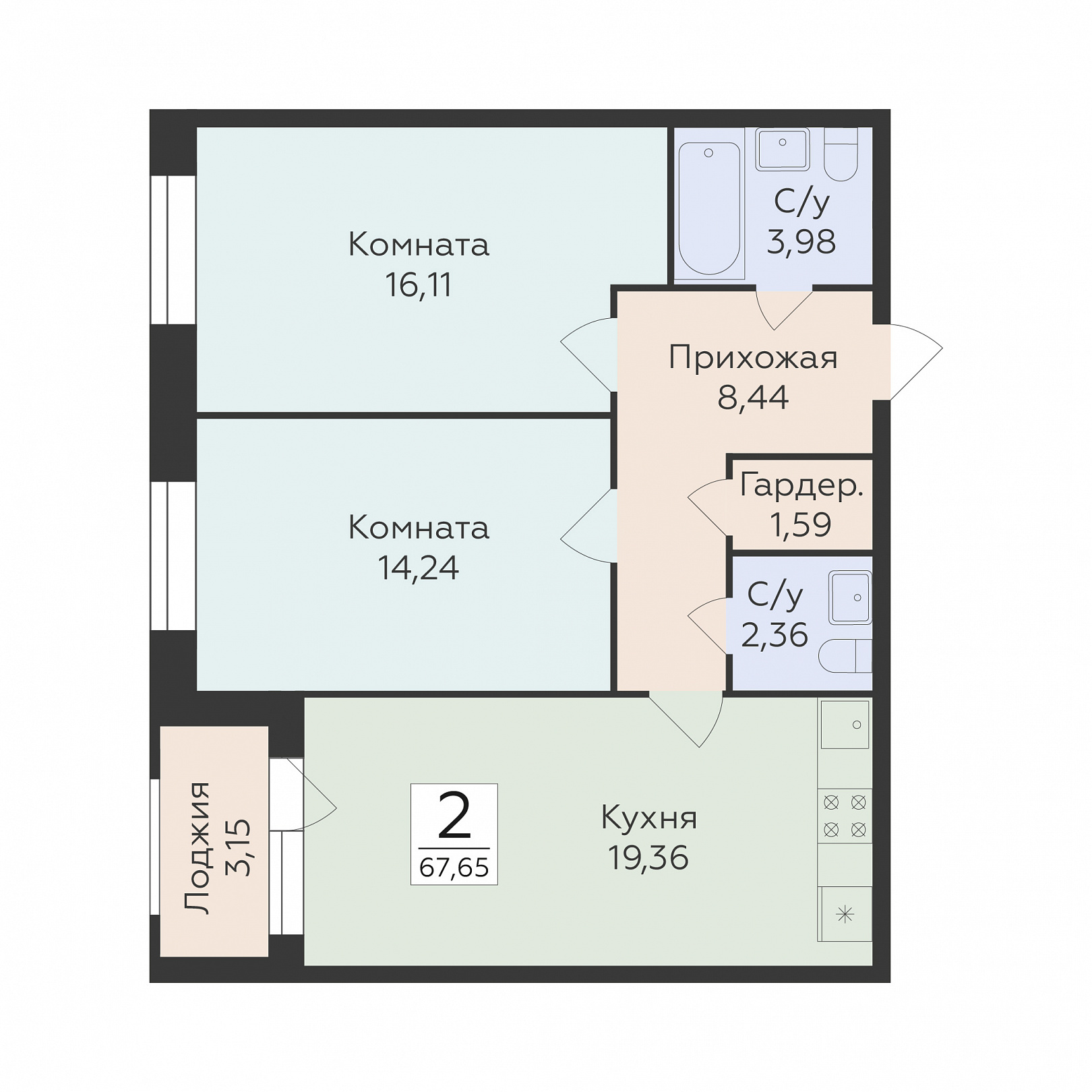2-комнатная квартира, 67.65 м2, 2 этаж, №6, Суворов сити 2