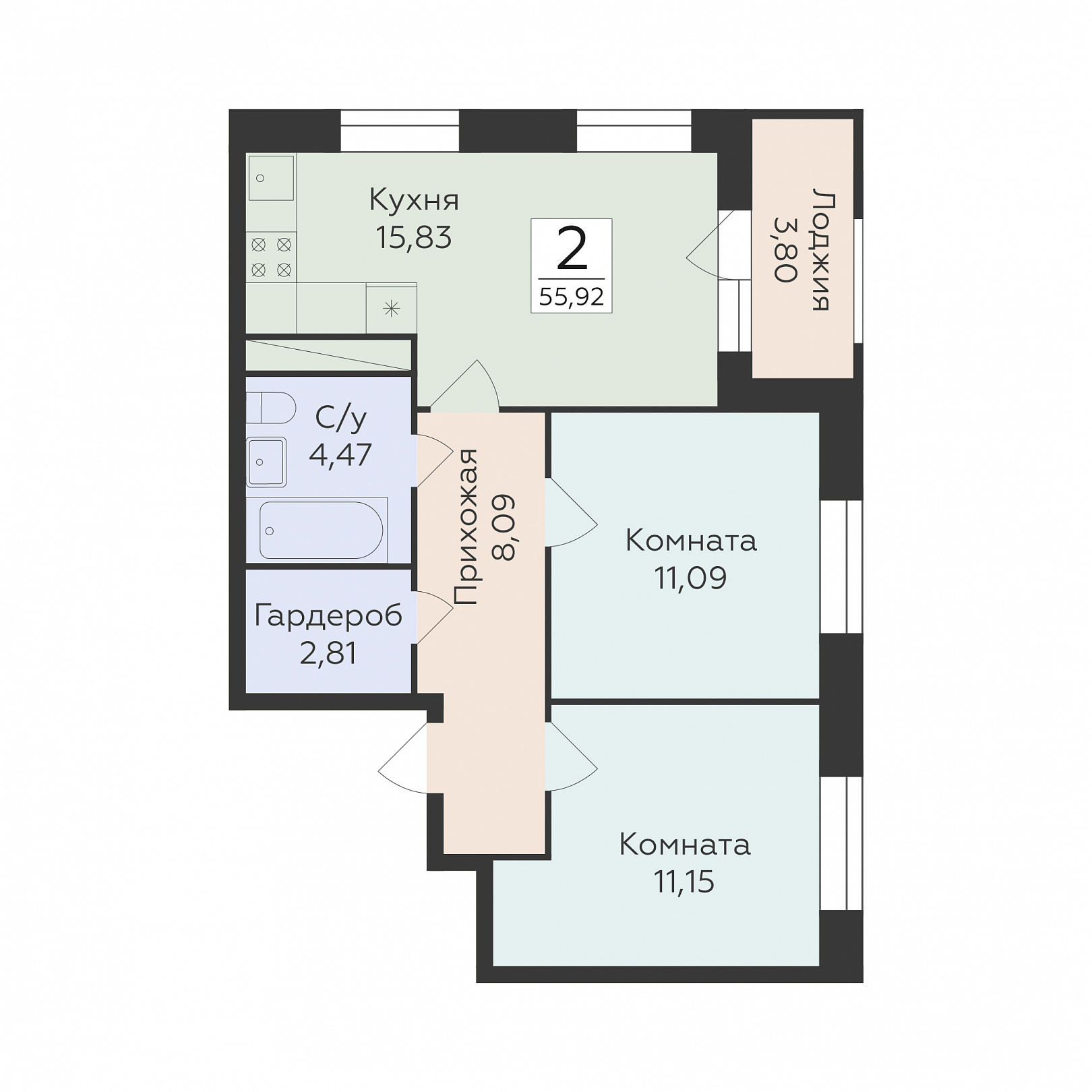 2-комнатная квартира, 55.92 м2, 6 этаж, №30, Суворов сити 2