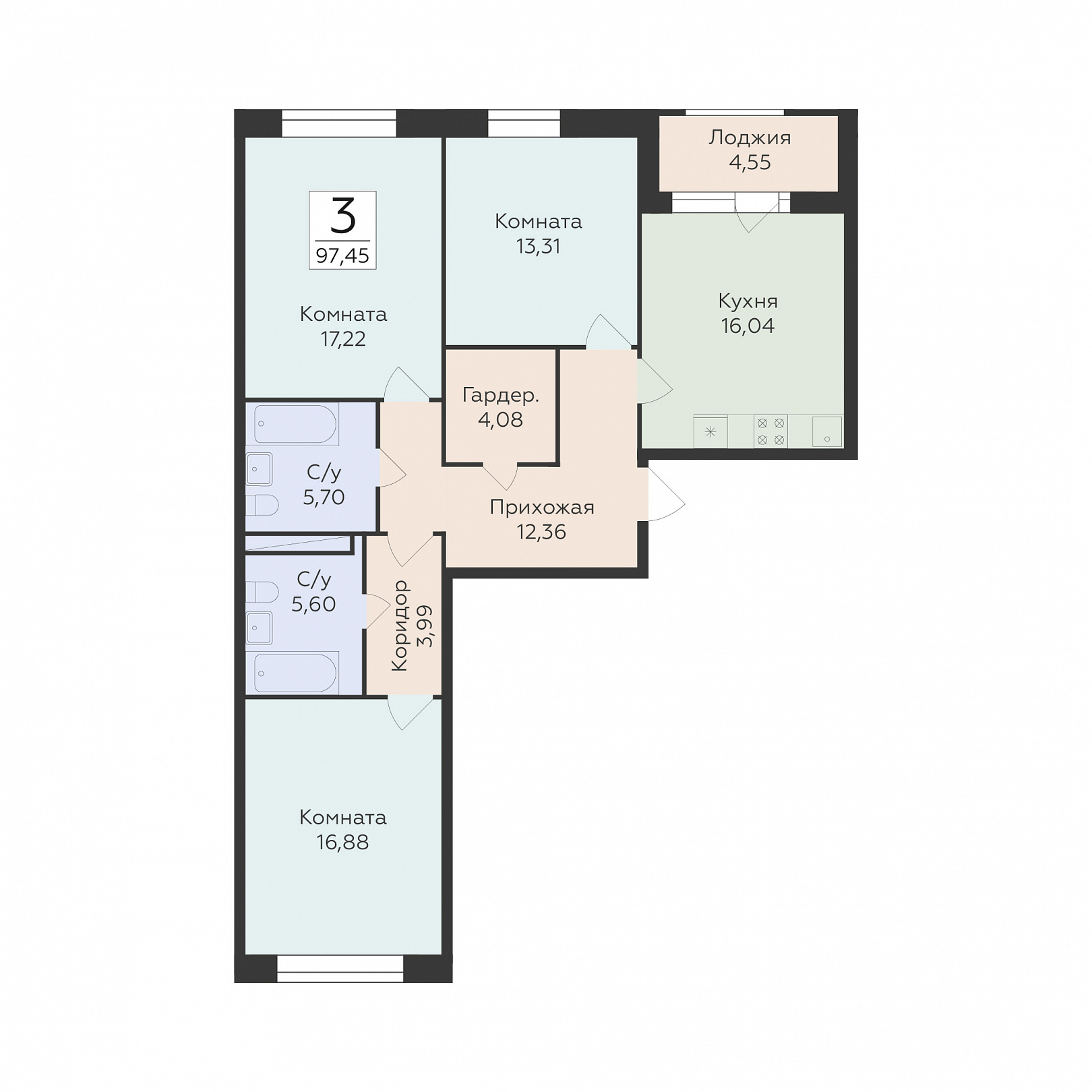 3-комнатная квартира, 97.45 м2, 8 этаж, №313, Суворов сити 2