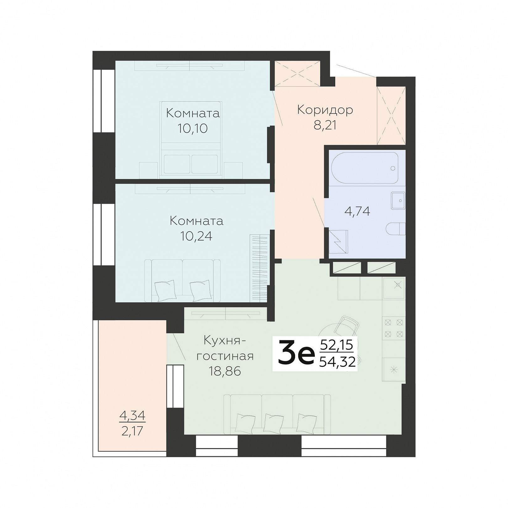 3-ком. квартира (Евро), 54.32 м2, 10 этаж, №98, Зарядье