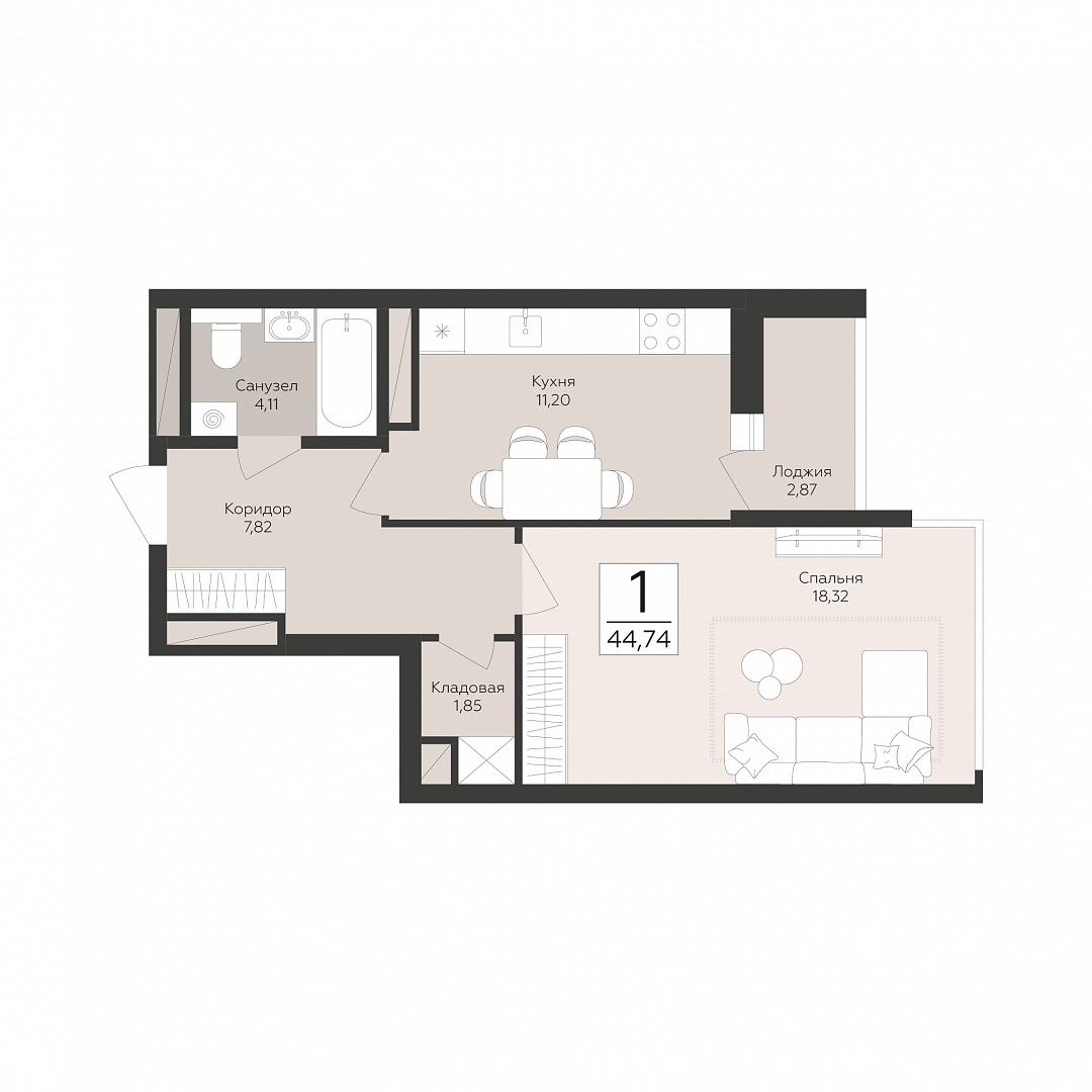 1-комнатная квартира, 44.74 м2, 11 этаж, №82, Скай