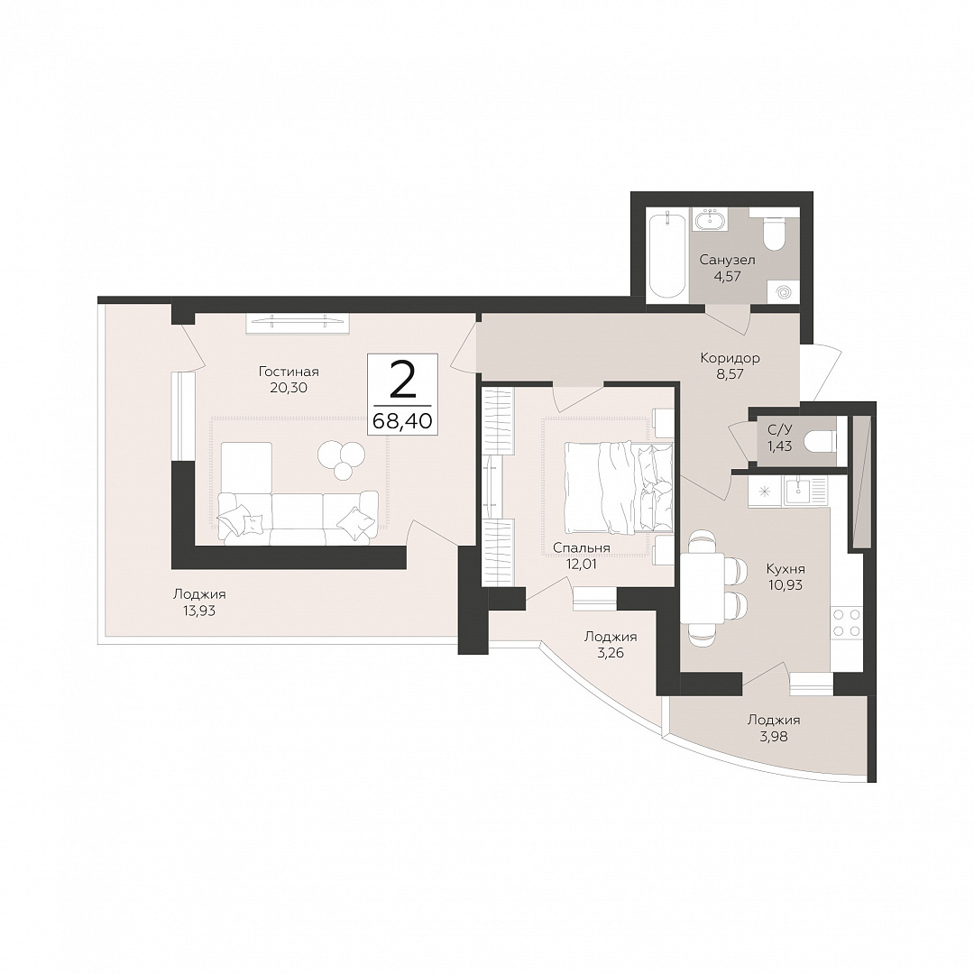 2-комнатная квартира, 68.4 м2, 12 этаж, №93, Скай