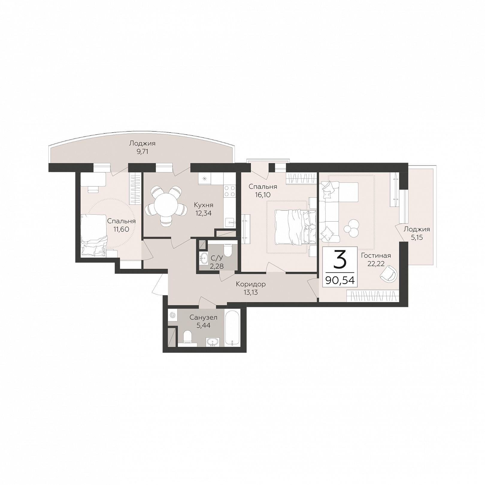 3-комнатная квартира, 90.54 м2, 5 этаж, №35, Скай
