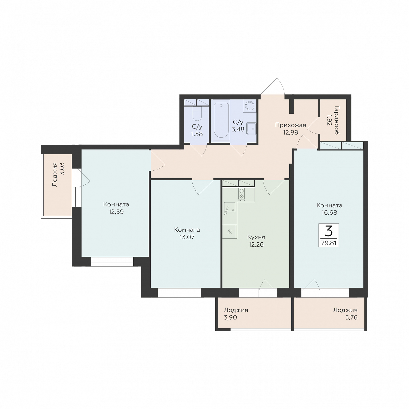 3-комнатная квартира, 79.81 м2, 14 этаж, №728, Flora