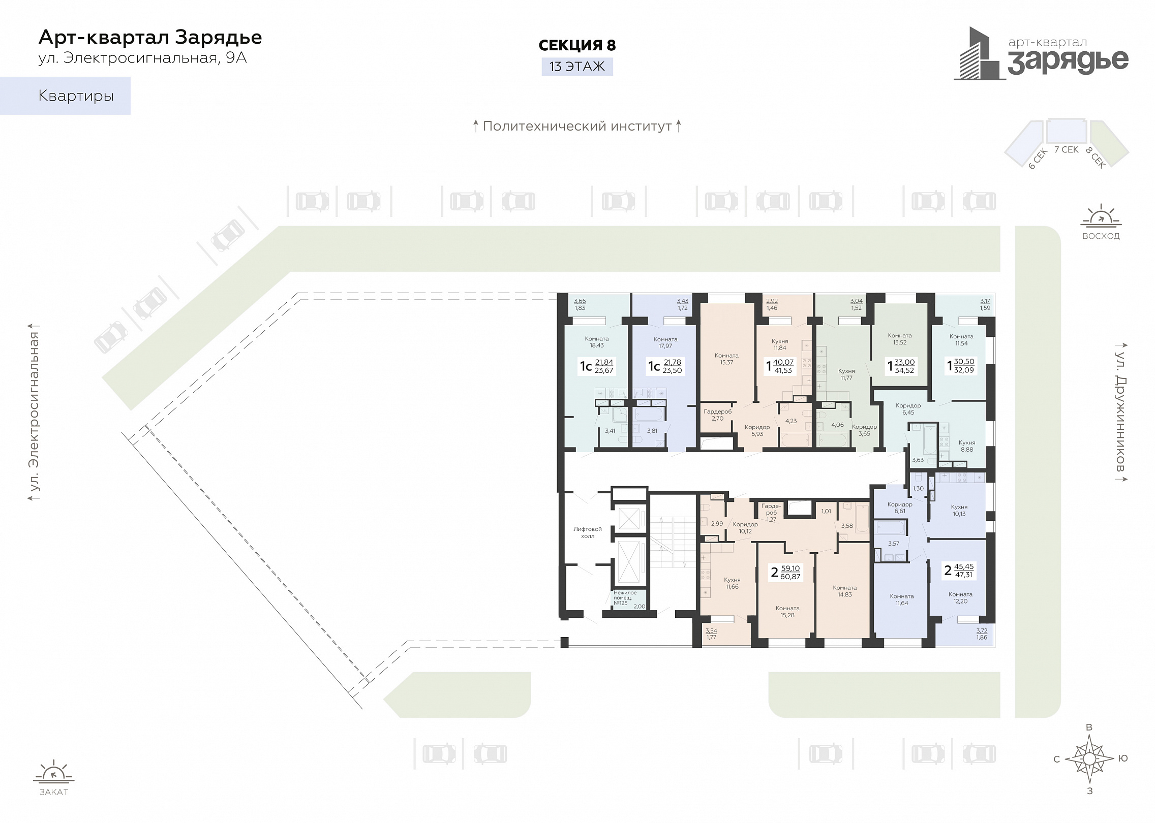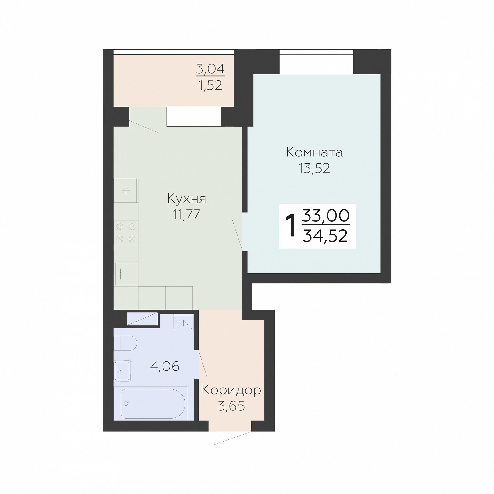 1-комнатная квартира, 34.52 м2, 13 этаж, №514, Зарядье