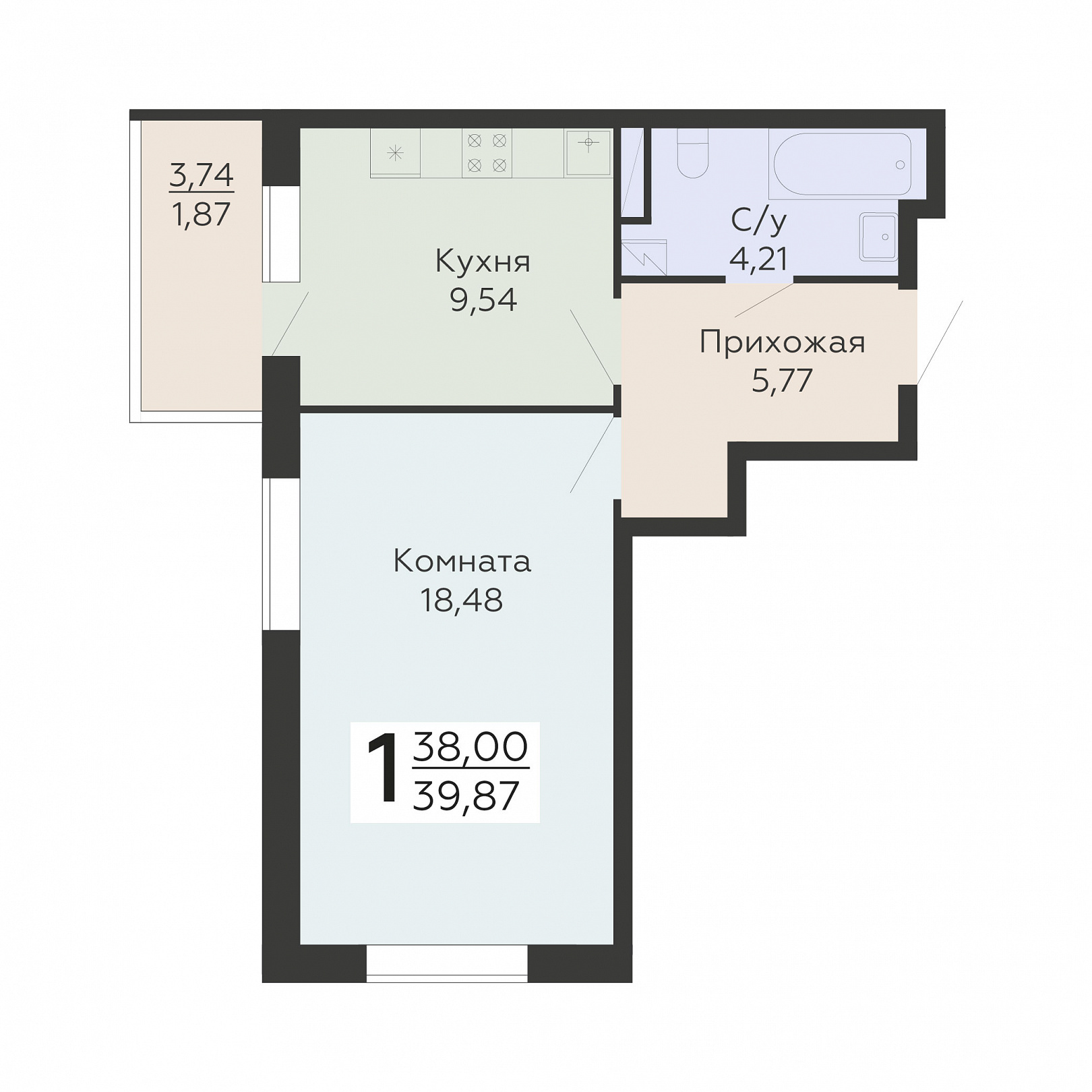 1-комнатная квартира, 39.87 м2, 2 этаж, №293, Никитинские сады