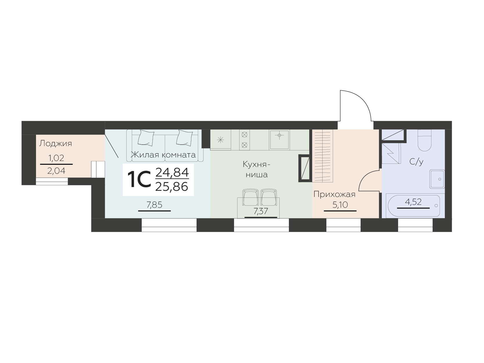 1-комнатная (студия), 25.86 м2, 10 этаж, №769, Заря