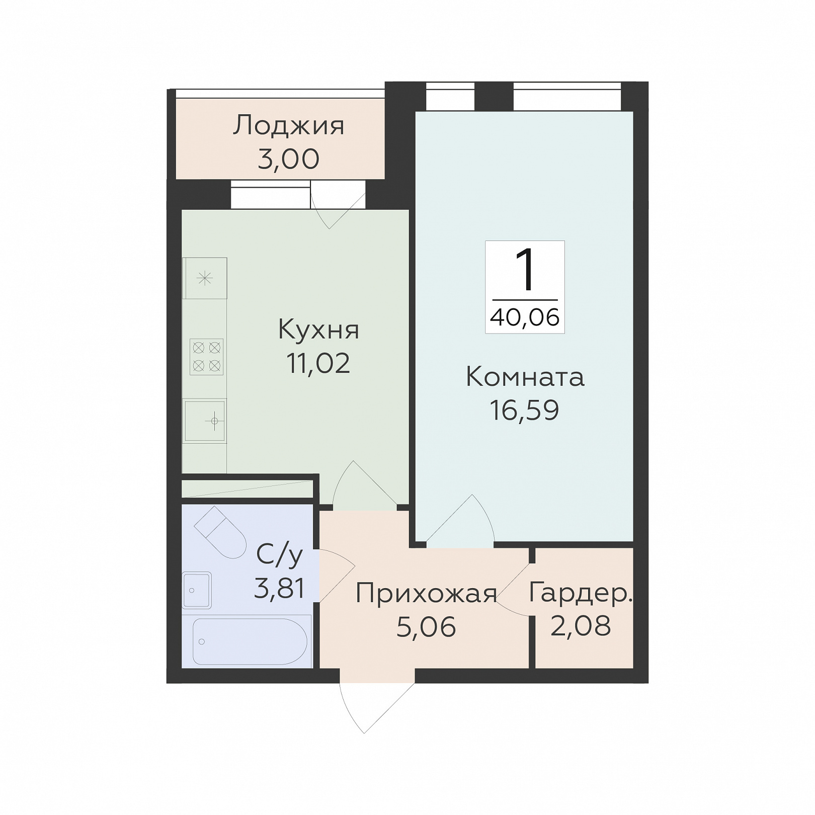 1-комнатная квартира, 40.06 м2, 17 этаж, №185, Квартал 45