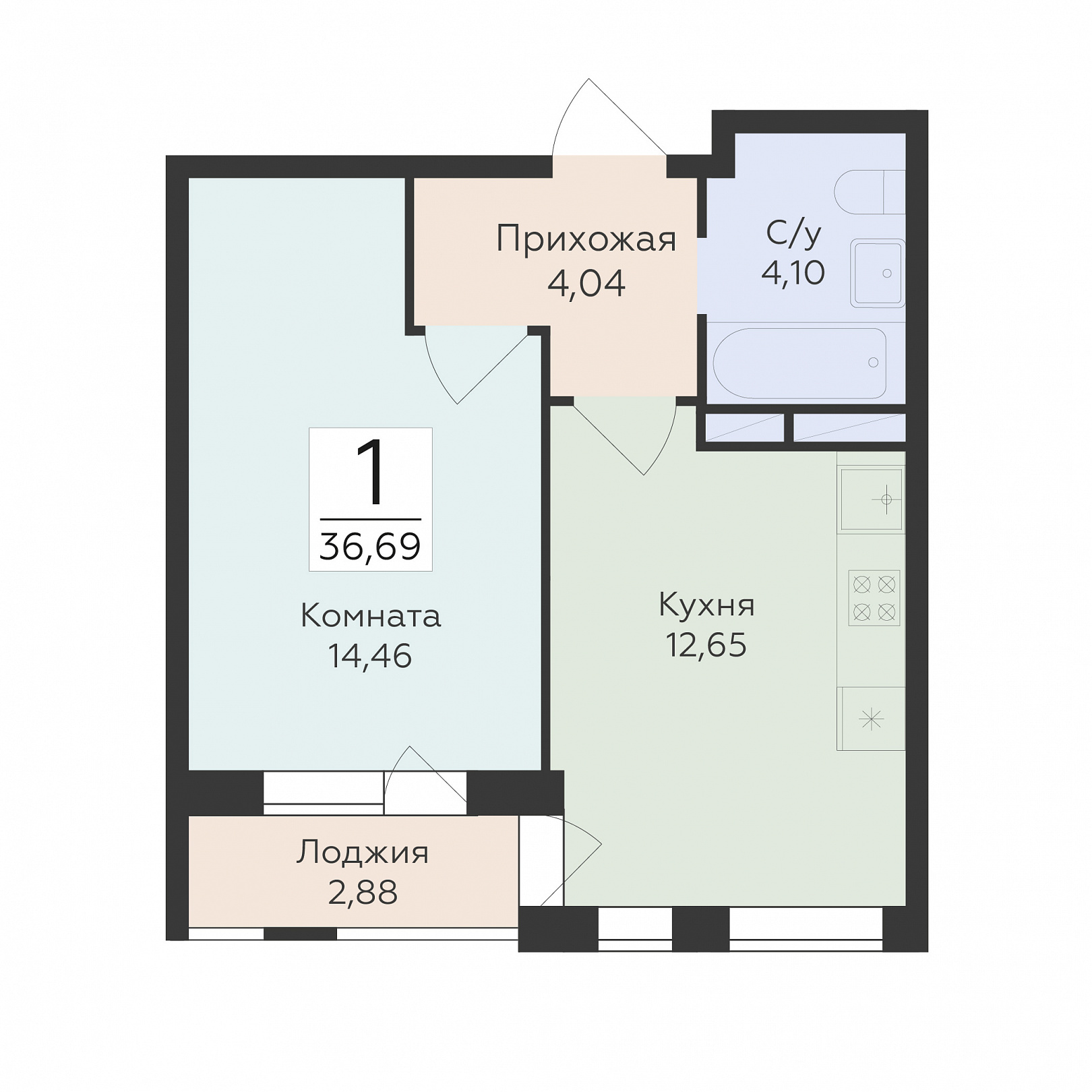 1-комнатная квартира, 36.69 м2, 13 этаж, №688, Квартал 45