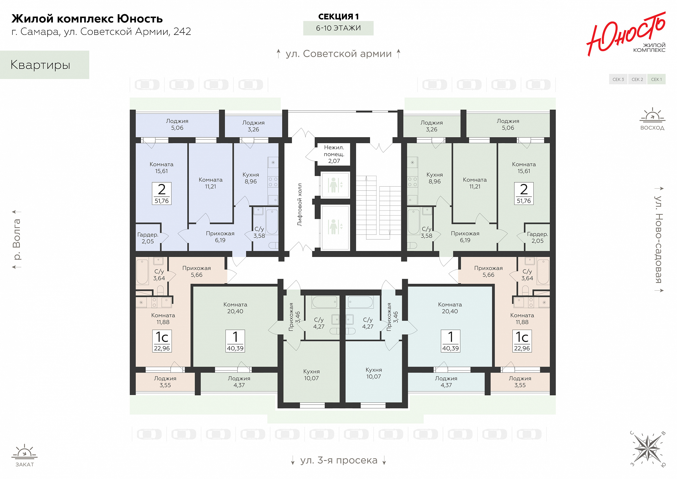 1-комнатная (студия), 40.39 м2, 6 этаж, №19, Юность