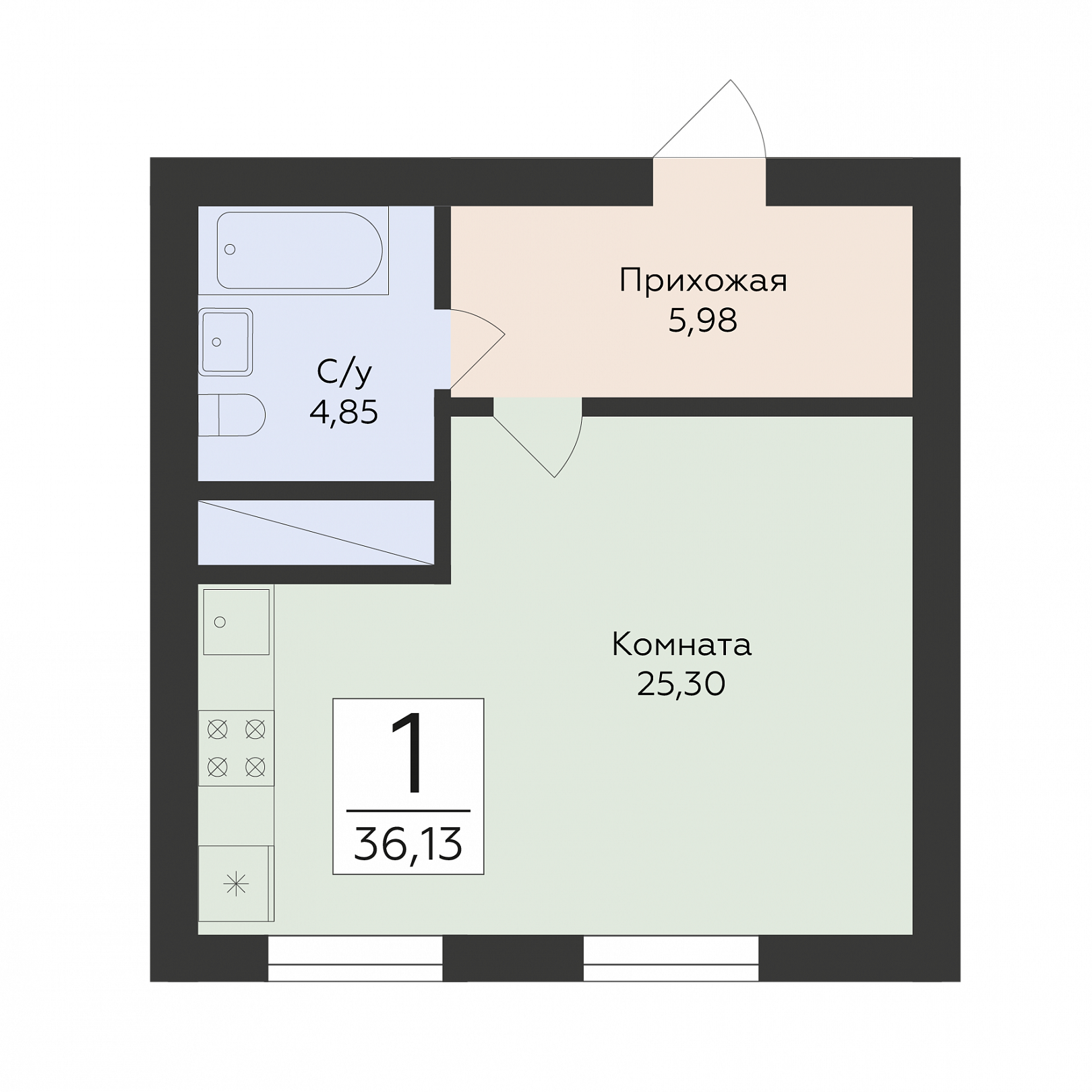 1-комнатная (студия), 36.13 м2, 1 этаж, №134, Юность