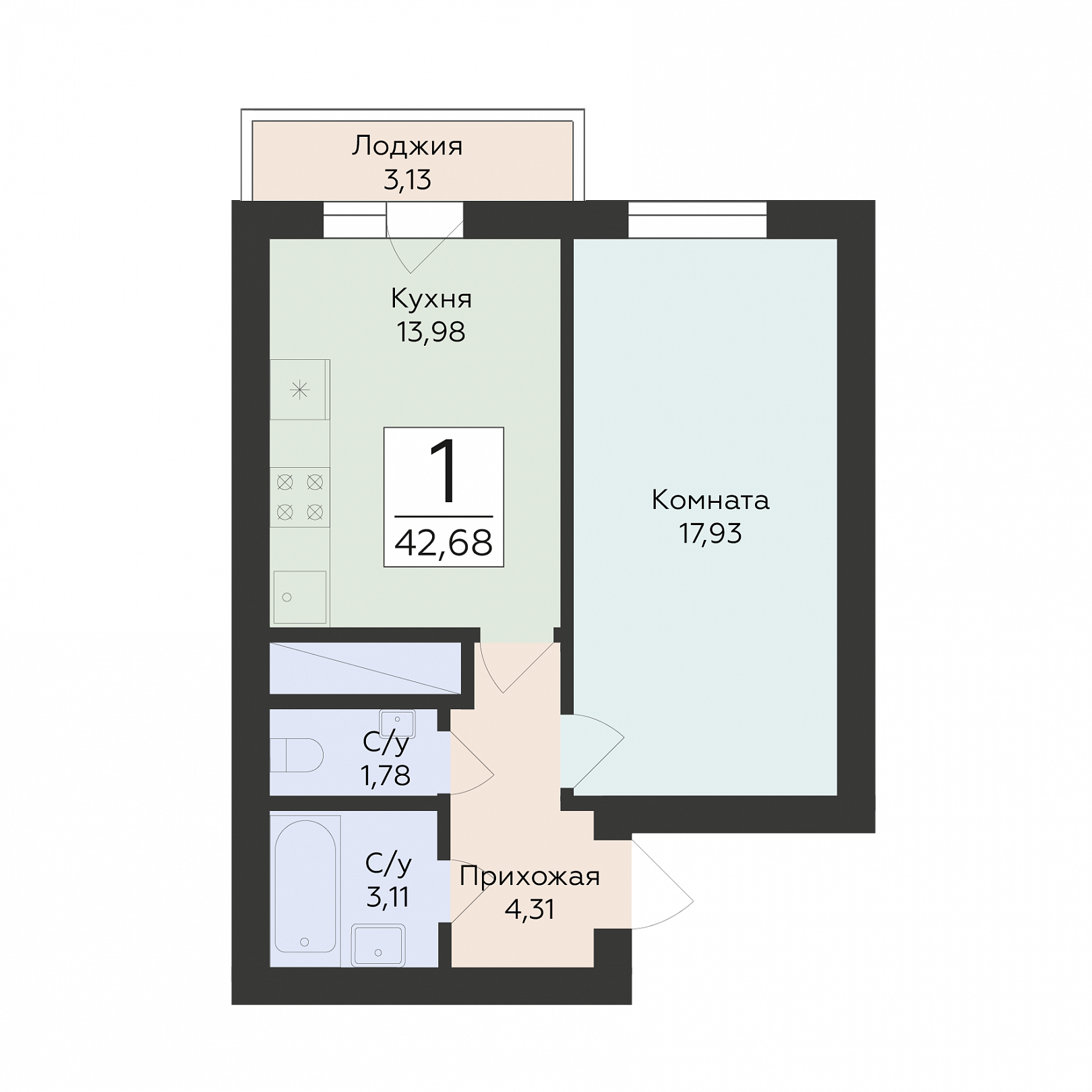 1-комнатная квартира, 42.68 м2, 10 этаж, №216, Юность