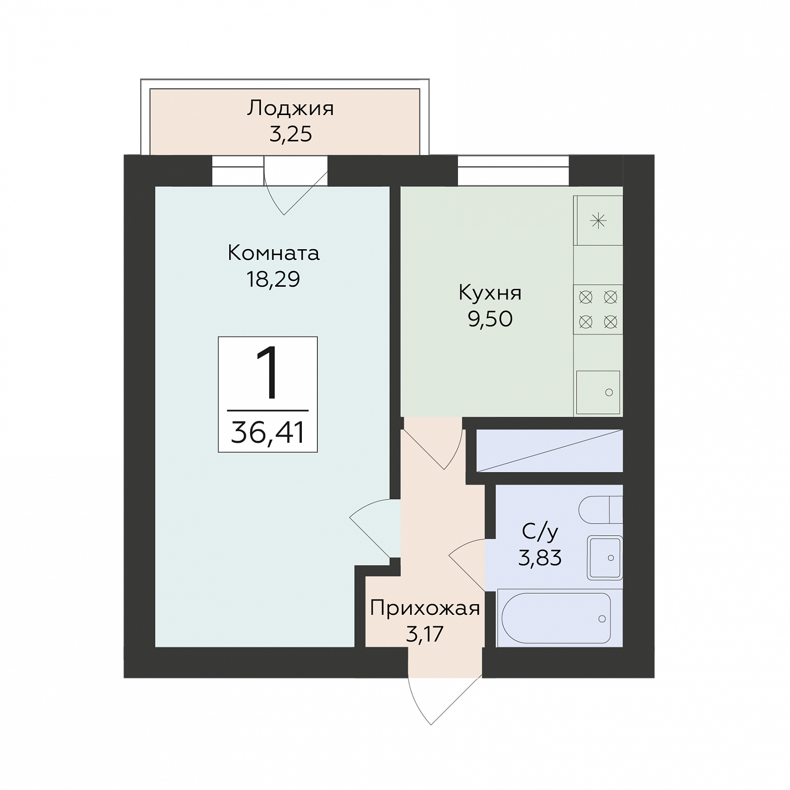 1-комнатная квартира, 36.41 м2, 1 этаж, №136, Юность