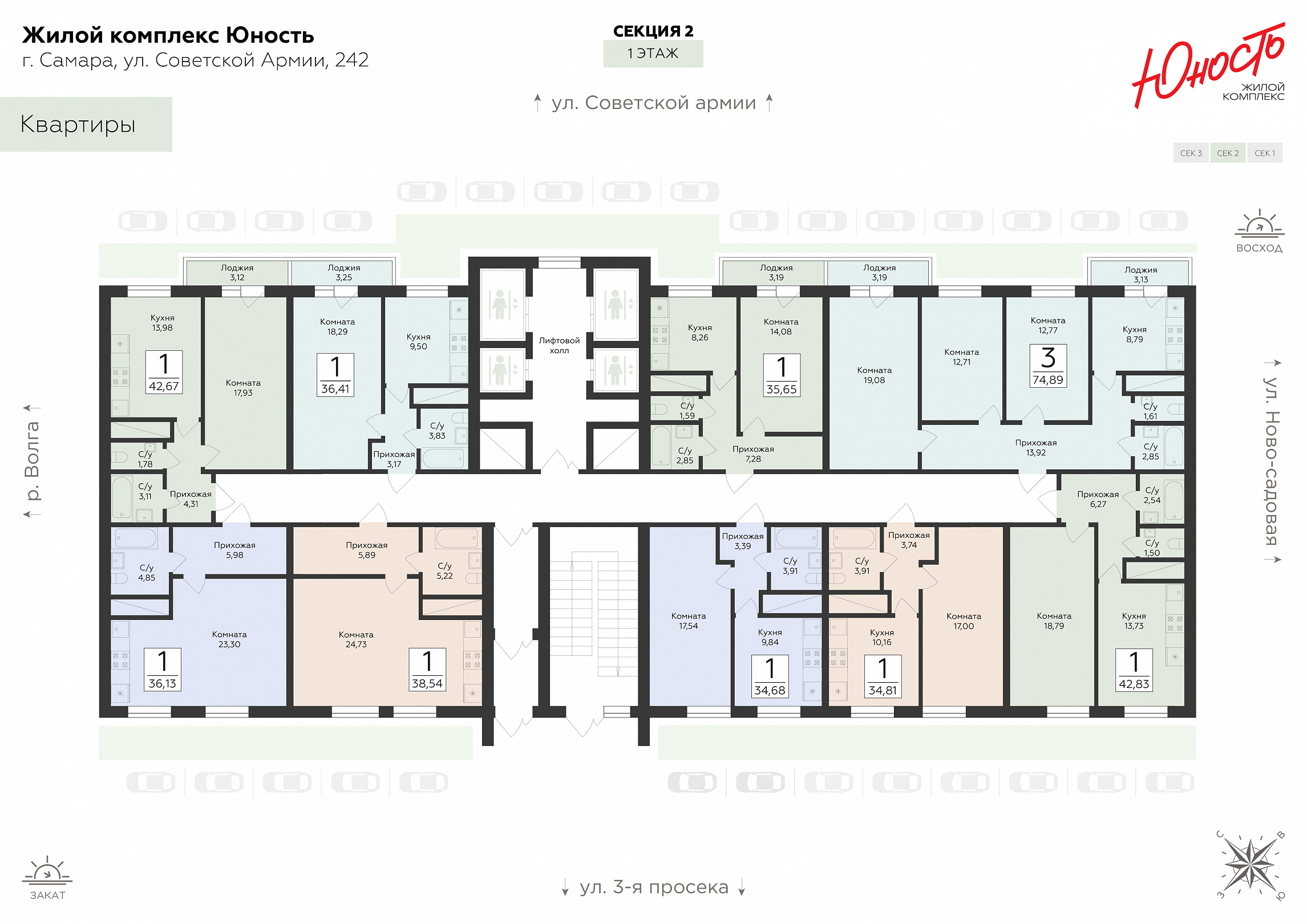 1-комнатная квартира, 35.65 м2, 1 этаж, №137, Юность