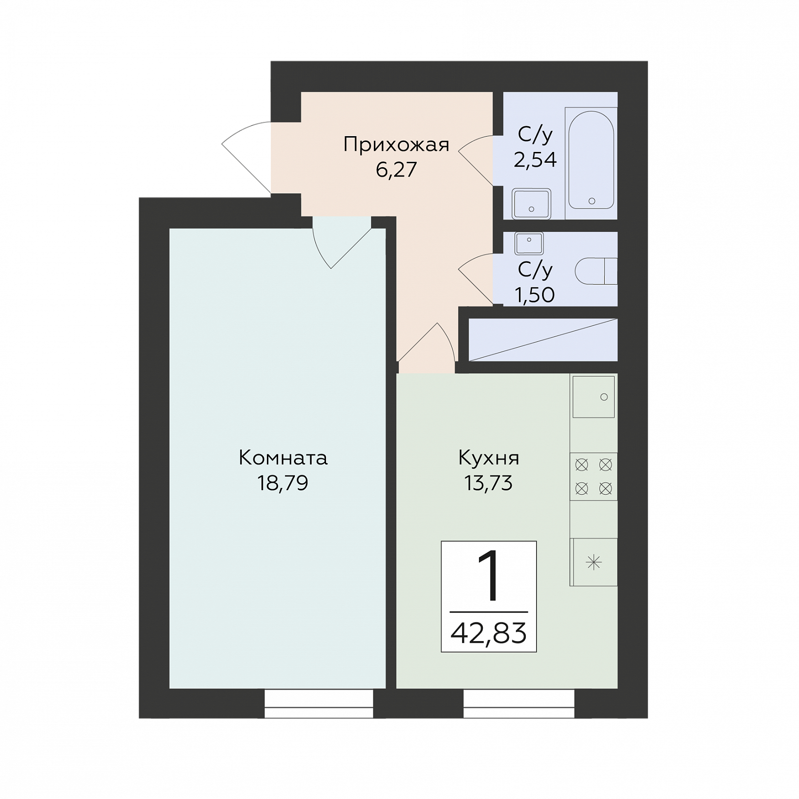 1-комнатная квартира, 42.83 м2, 1 этаж, №139, Юность