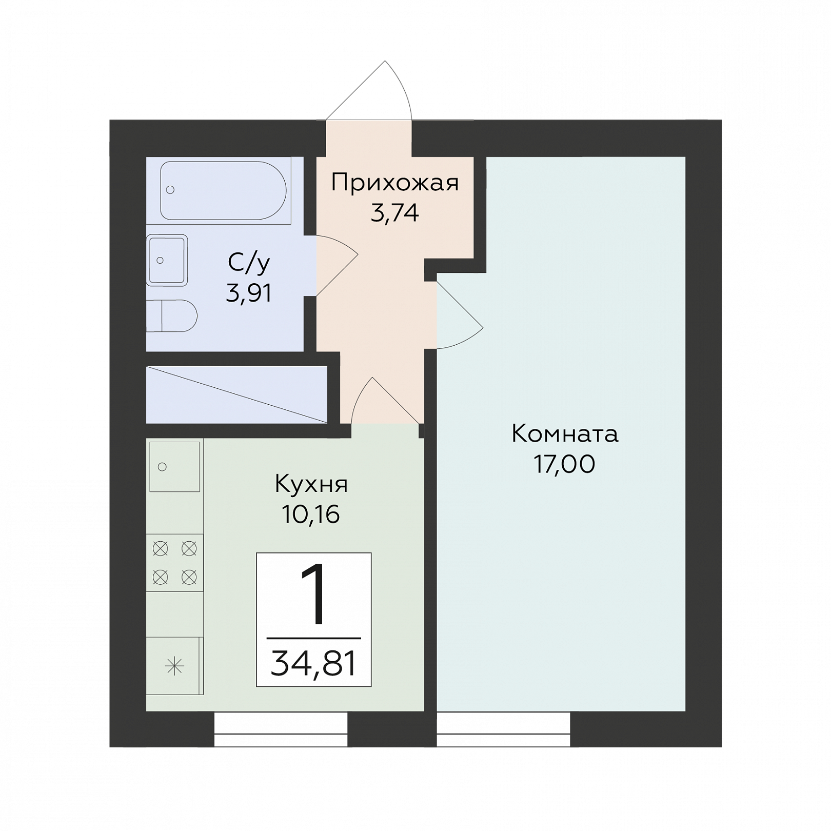 1-комнатная квартира, 34.81 м2, 1 этаж, №140, Юность