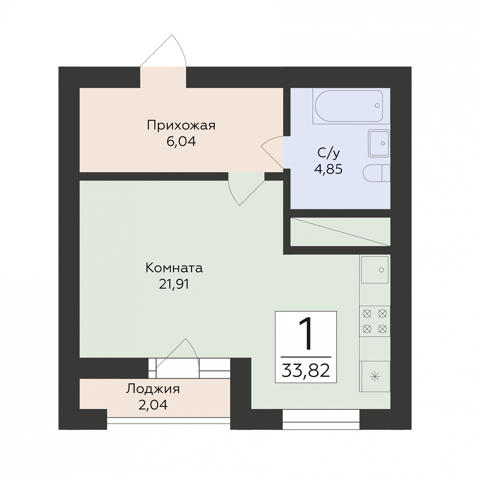 1-комнатная квартира, 33.82 м2, 1 этаж, №356, Юность