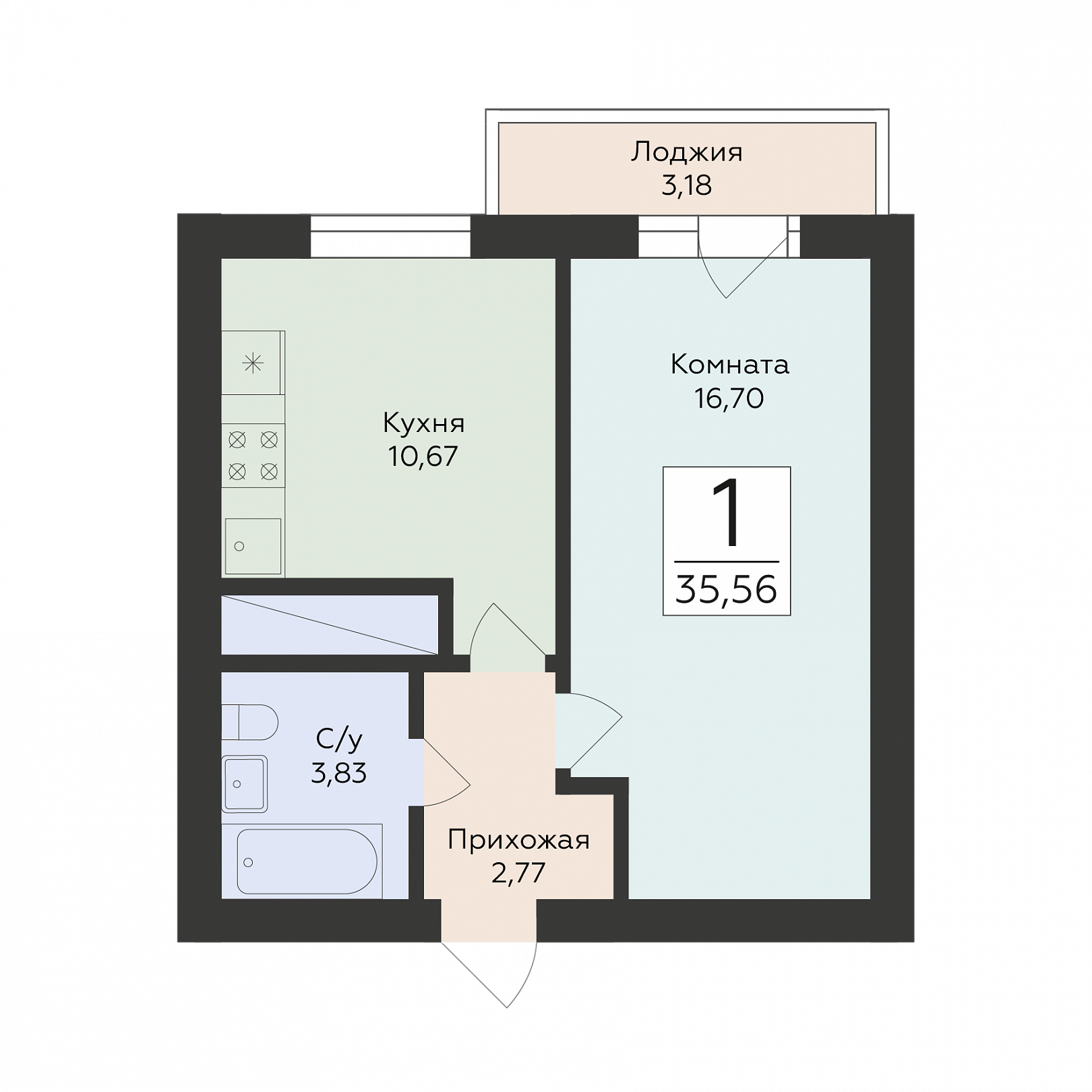 1-комнатная квартира, 35.56 м2, 15 этаж, №478, Юность