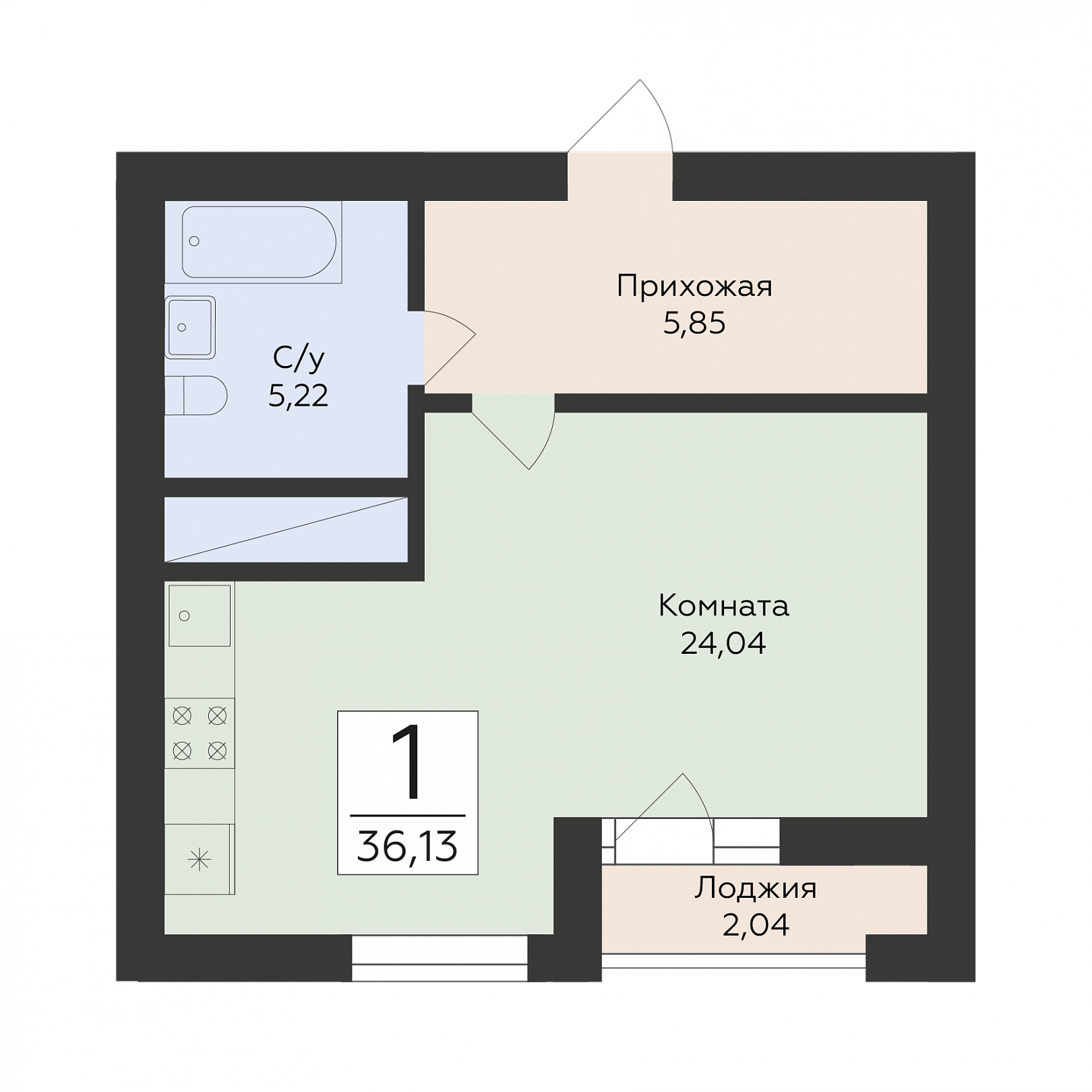 1-комнатная (студия), 36.13 м2, 3 этаж, №375, Юность