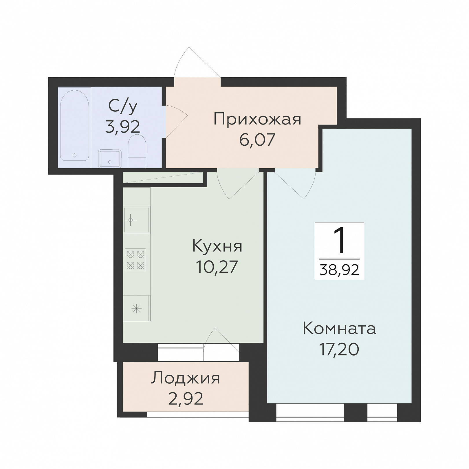 1-комнатная квартира, 38.92 м2, 18 этаж, №201, Квартал 45