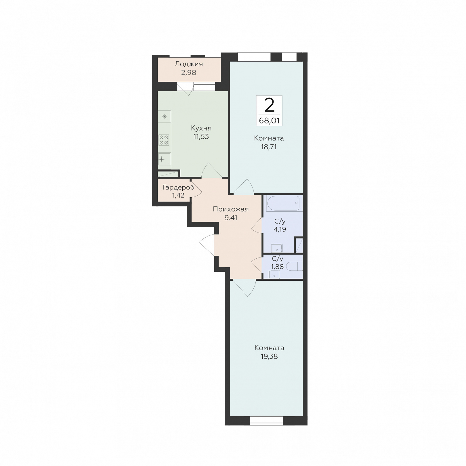 2-комнатная квартира, 68.01 м2, 11 этаж, №537, Квартал 45