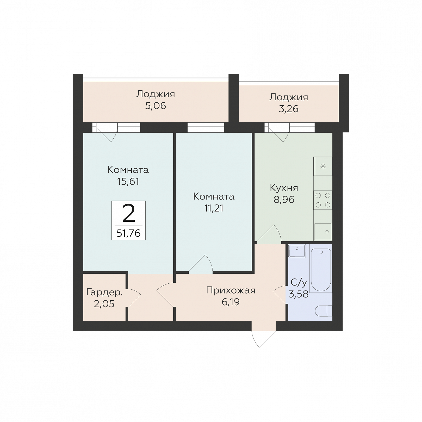 2-комнатная квартира, 51.76 м2, 6 этаж, №22, Юность