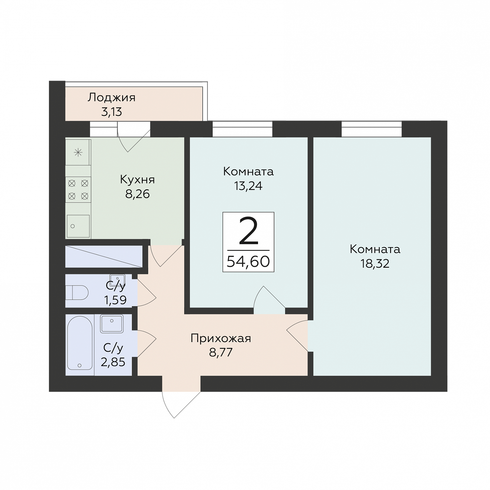 2-комнатная квартира, 54.6 м2, 20 этаж, №308, Юность