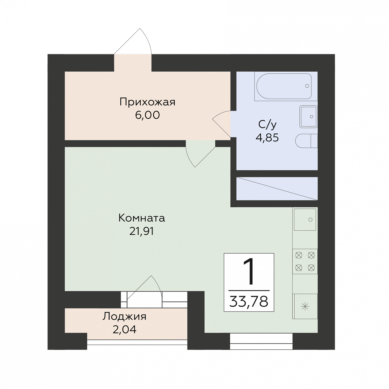 1-комнатная (студия), 33.78 м2, 16 этаж, №491, Юность