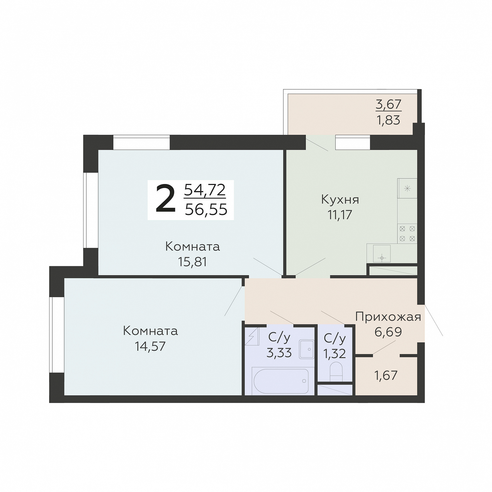 2-комнатная квартира, 56.55 м2, 17 этаж, №791, Никитинские сады