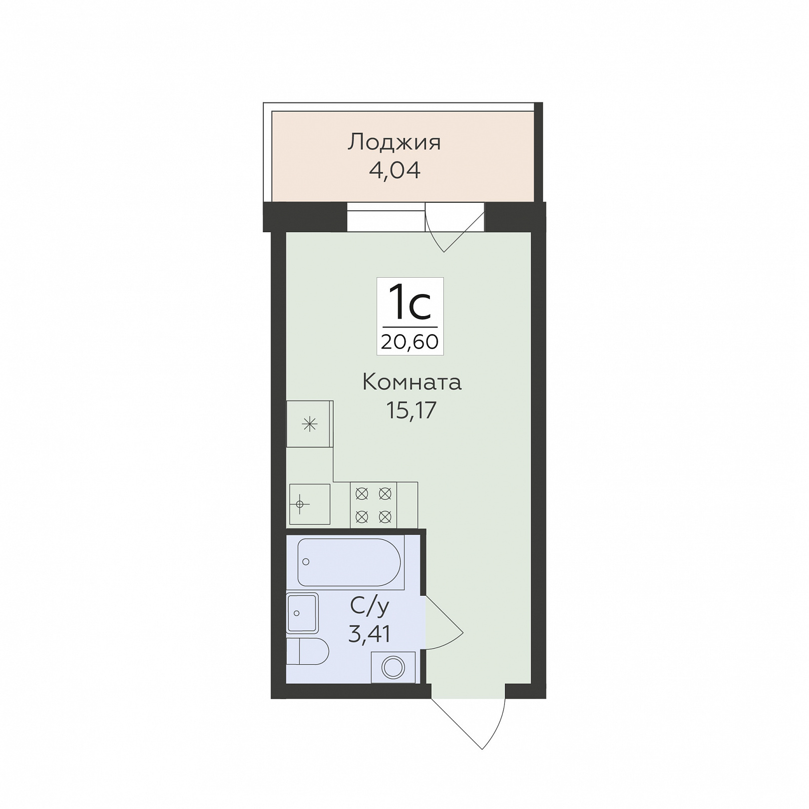 1-комнатная (студия), 20.6 м2, 2 этаж, №9, Flora