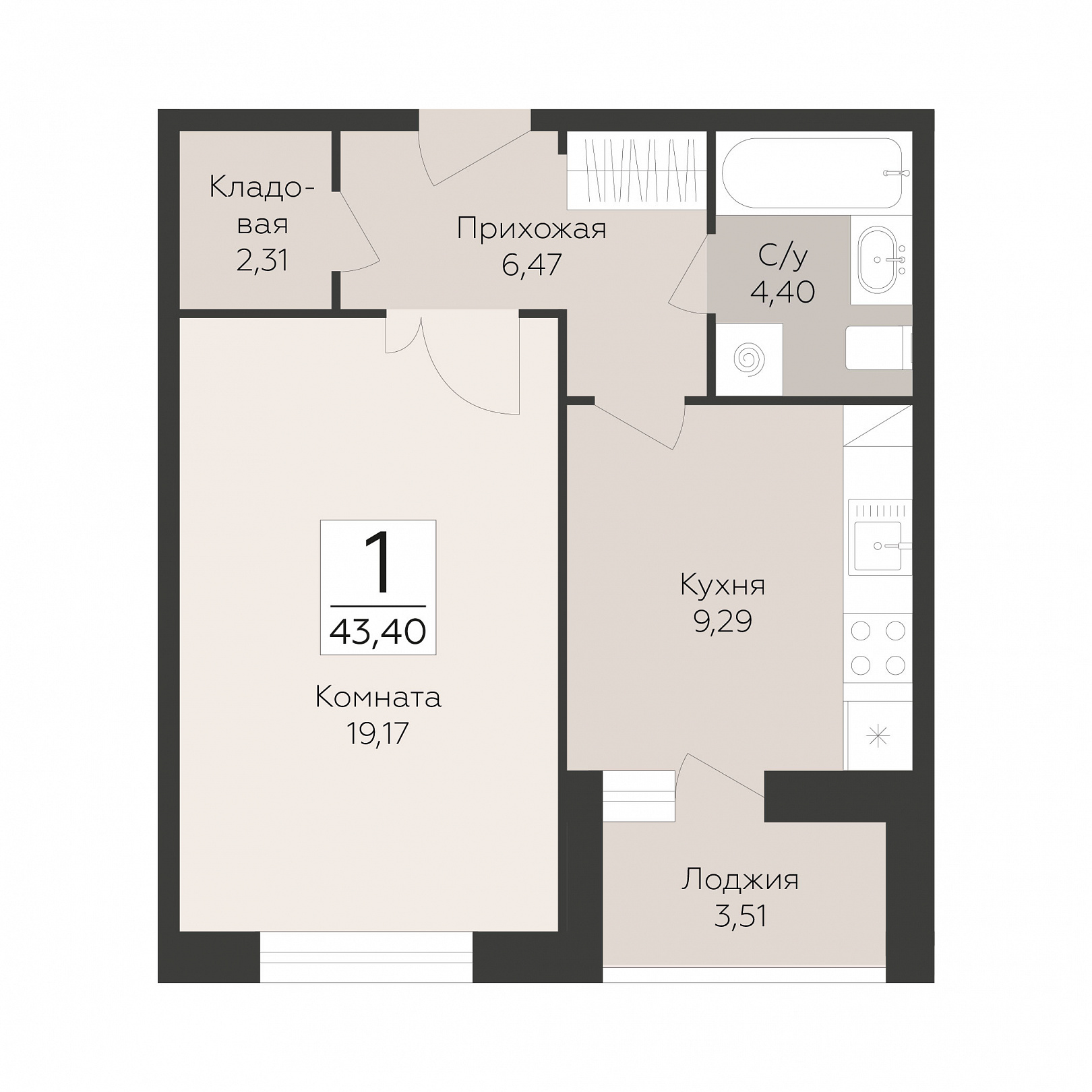 1-комнатная квартира, 43.4 м2, 11 этаж, №57, Пахра сити