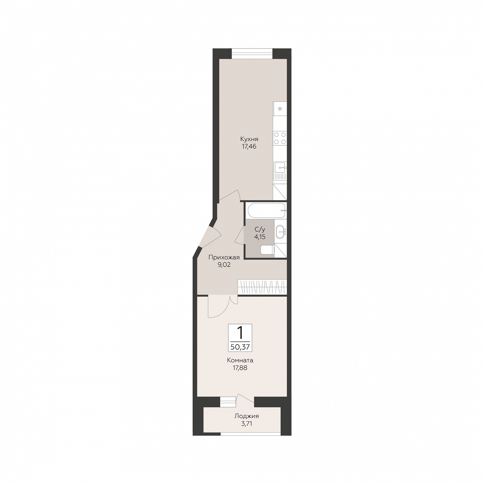 1-комнатная квартира, 50.37 м2, 5 этаж, №457, Пахра сити