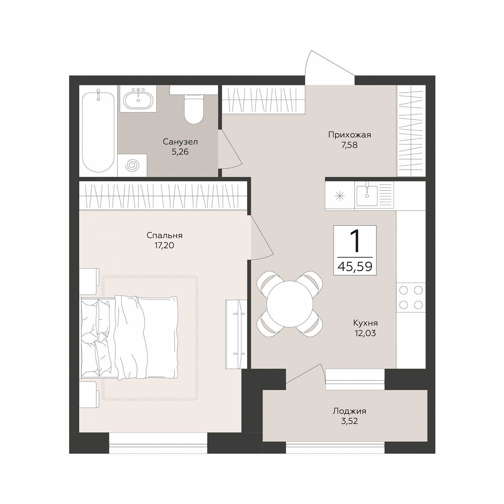 1-комнатная квартира, 45.59 м2, 1 этаж, №76, Эклипс