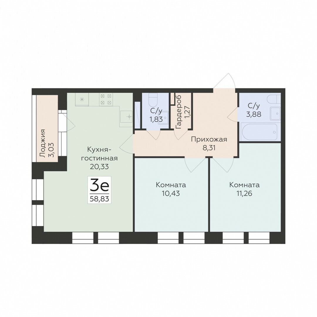 3-ком. квартира (Евро), 58.83 м2, 6 этаж, №404, Октябрьский квартал