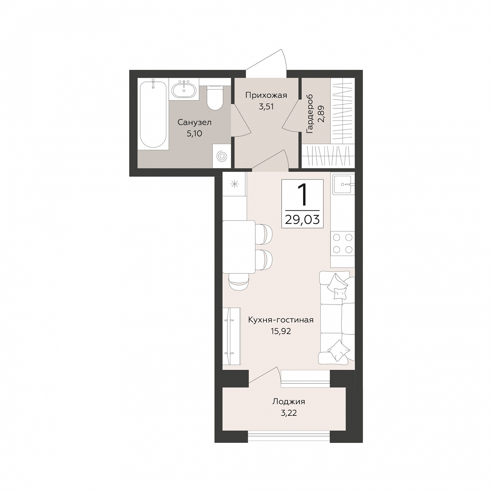 1-комнатная (студия), 29.03 м2, 6 этаж, №33, Эклипс