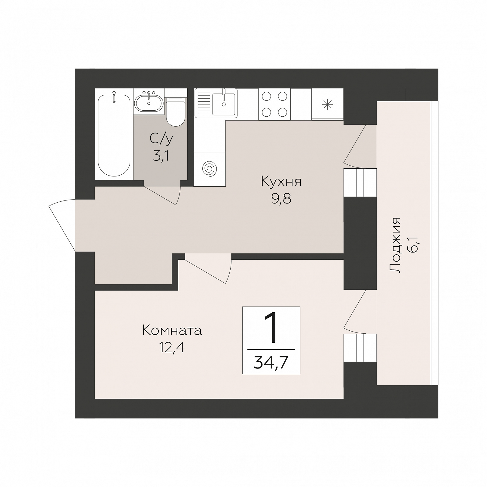 1-комнатная квартира, 34.7 м2, 1 этаж, №33, Тургенев