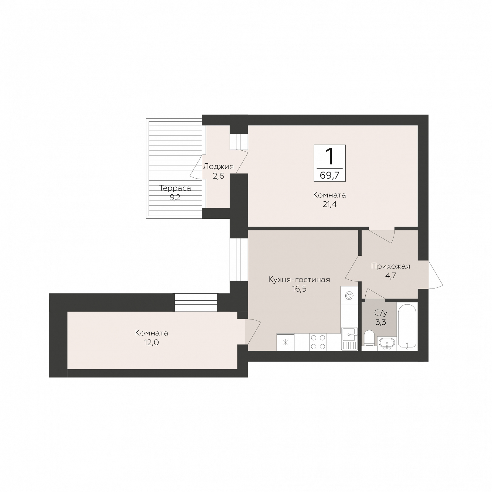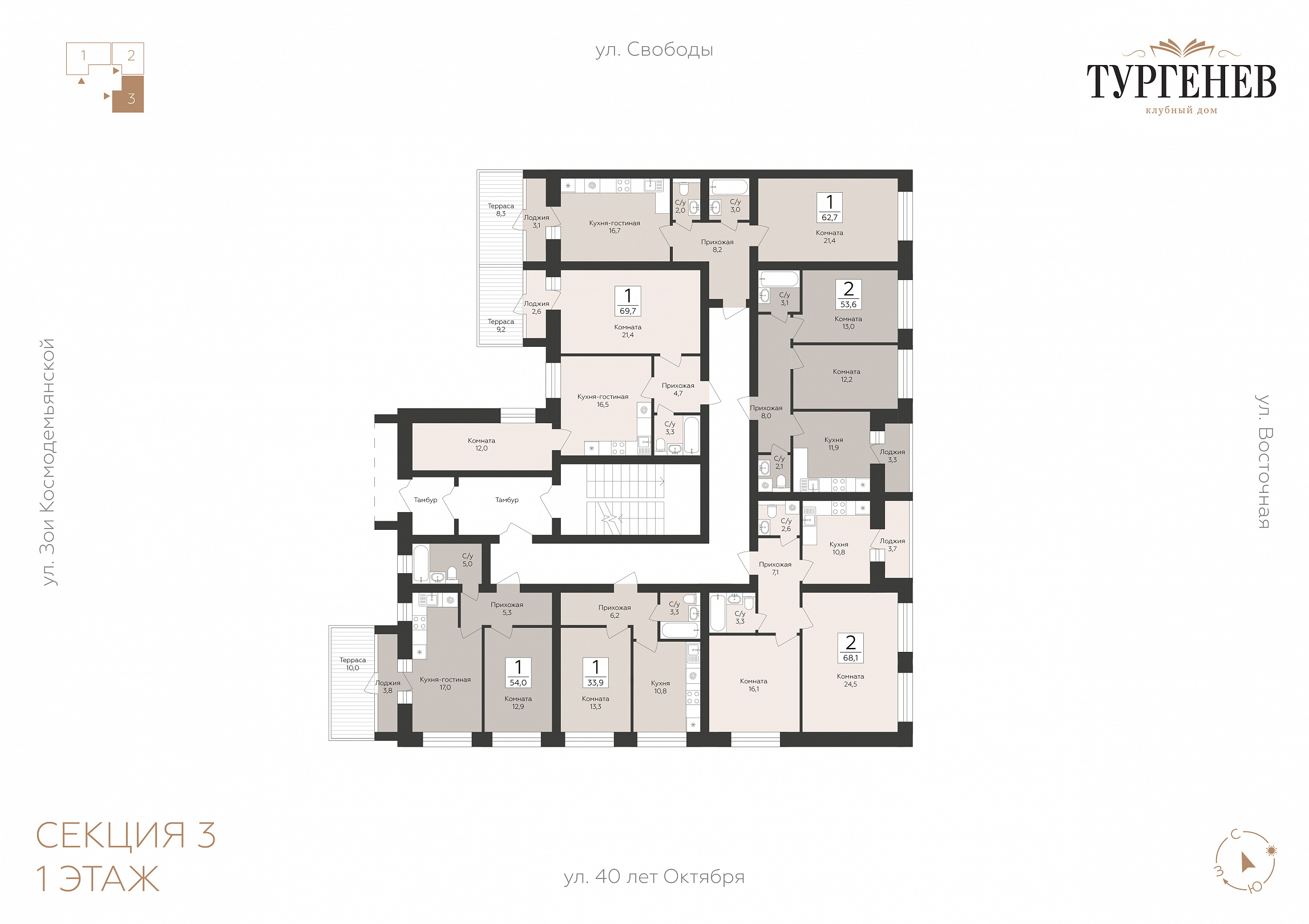 1-комнатная квартира, 69.7 м2, 1 этаж, №50, Тургенев