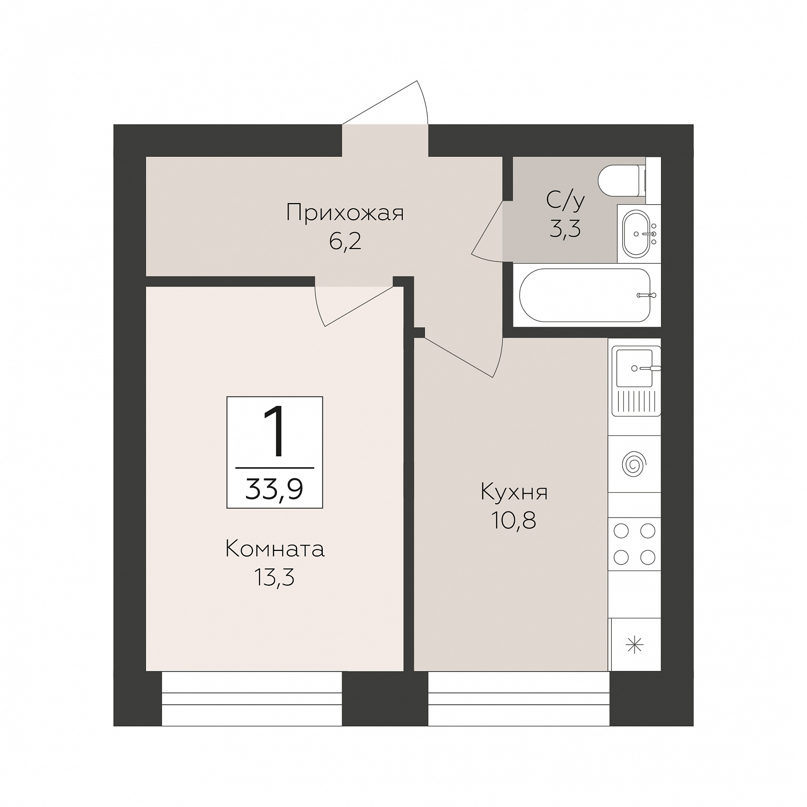 1-комнатная квартира, 33.9 м2, 1 этаж, №54, Тургенев