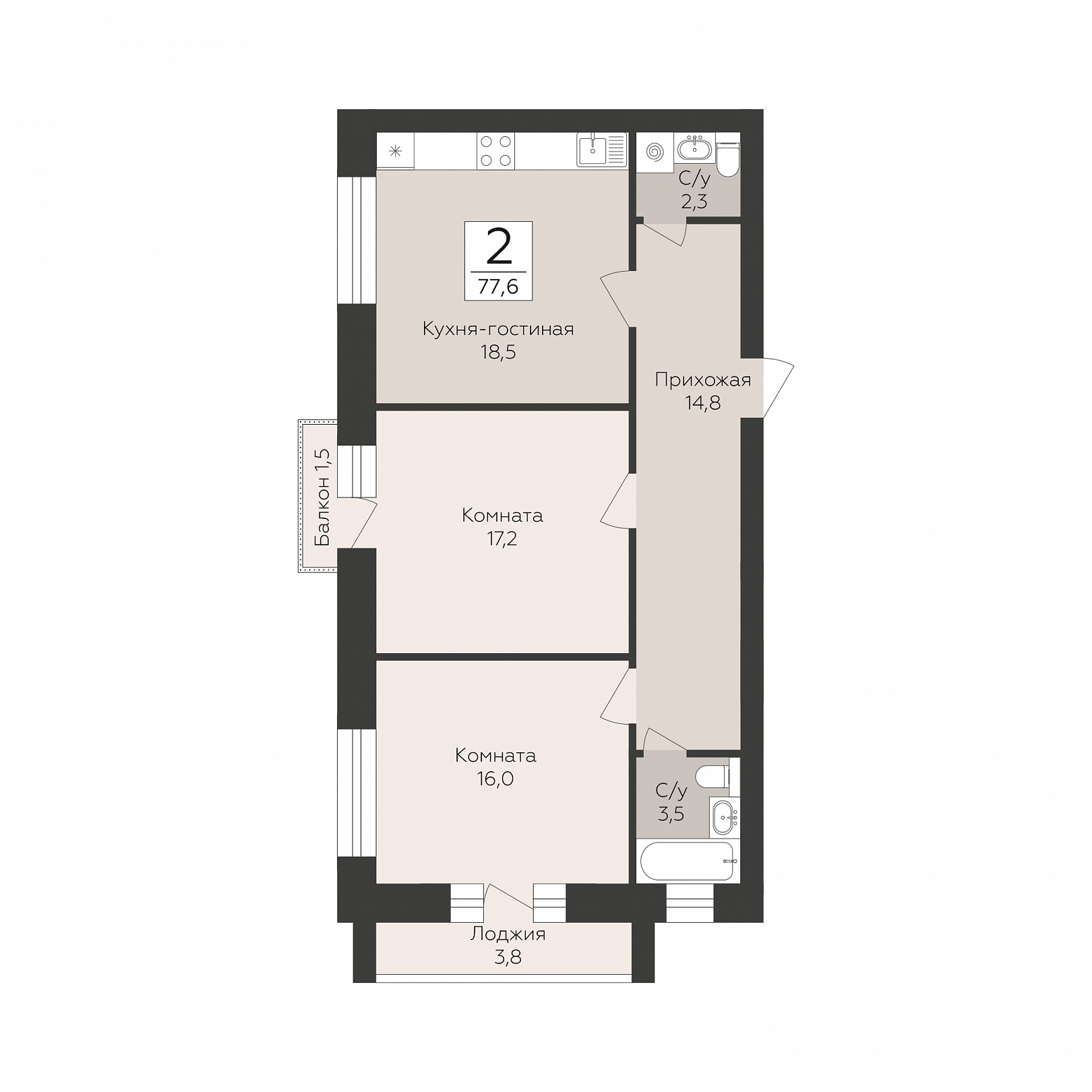 2-комнатная квартира, 77.6 м2, 3 этаж, №16, Тургенев