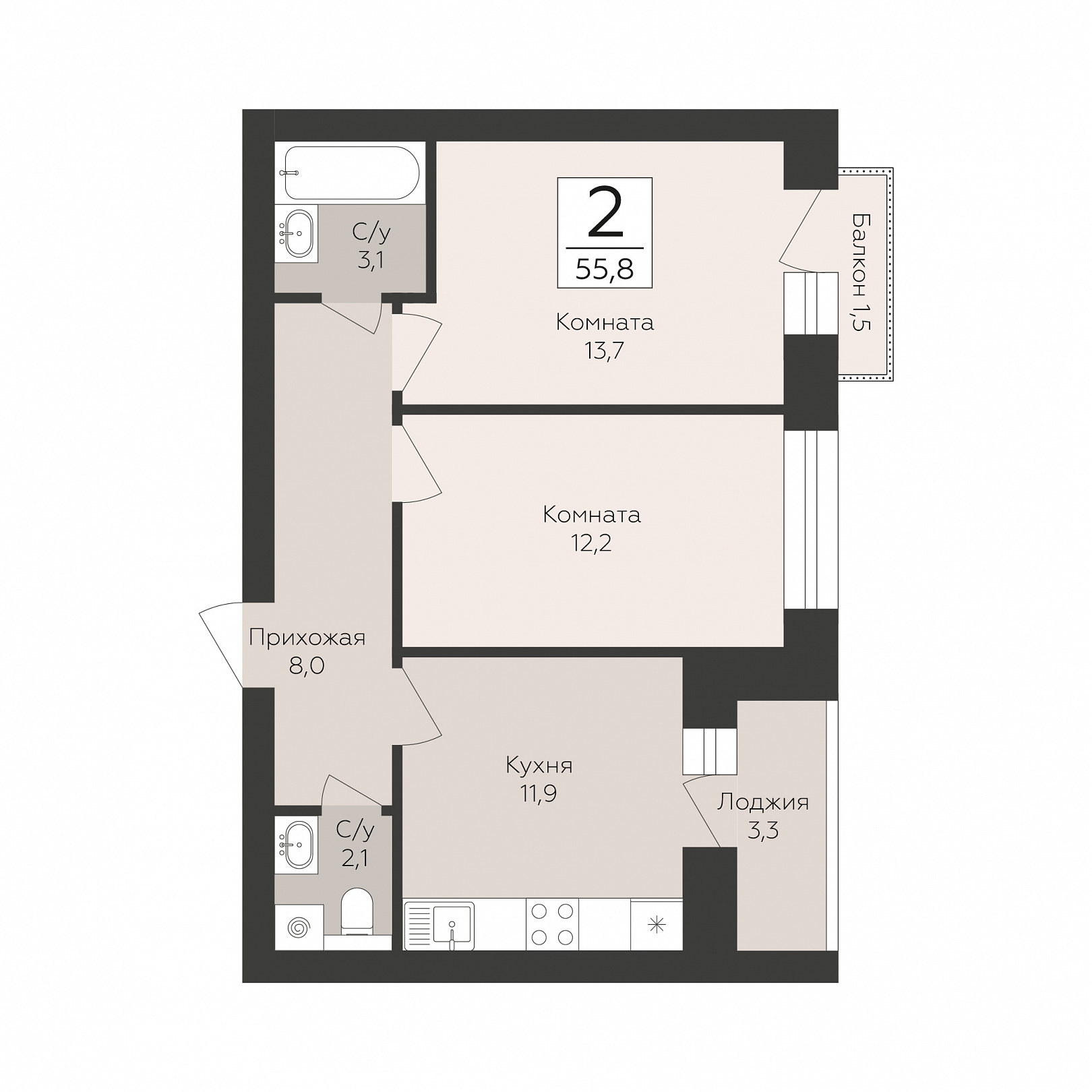 2-комнатная квартира, 55.8 м2, 4 этаж, №70, Тургенев