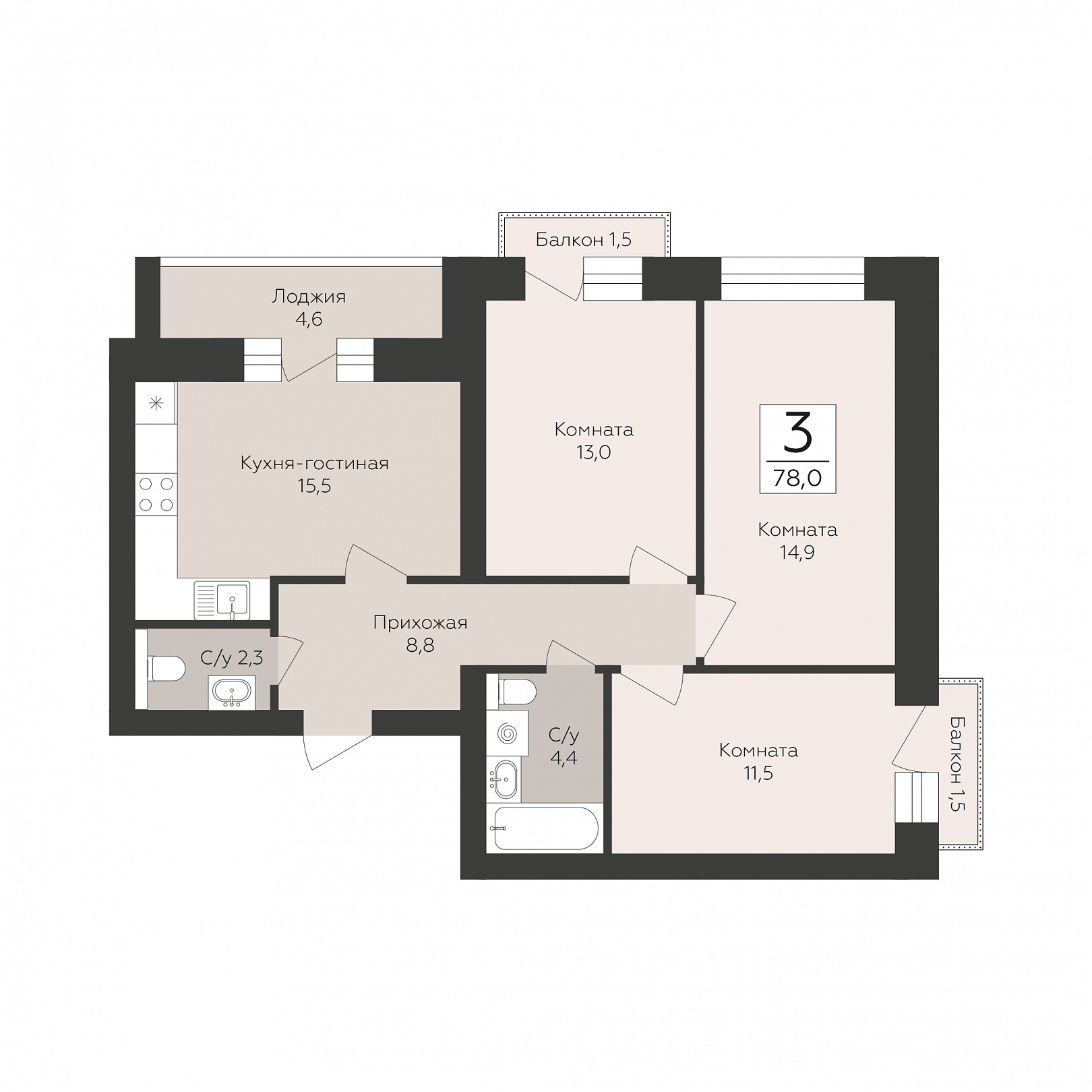 3-комнатная квартира, 78 м2, 2 этаж, №37, Тургенев