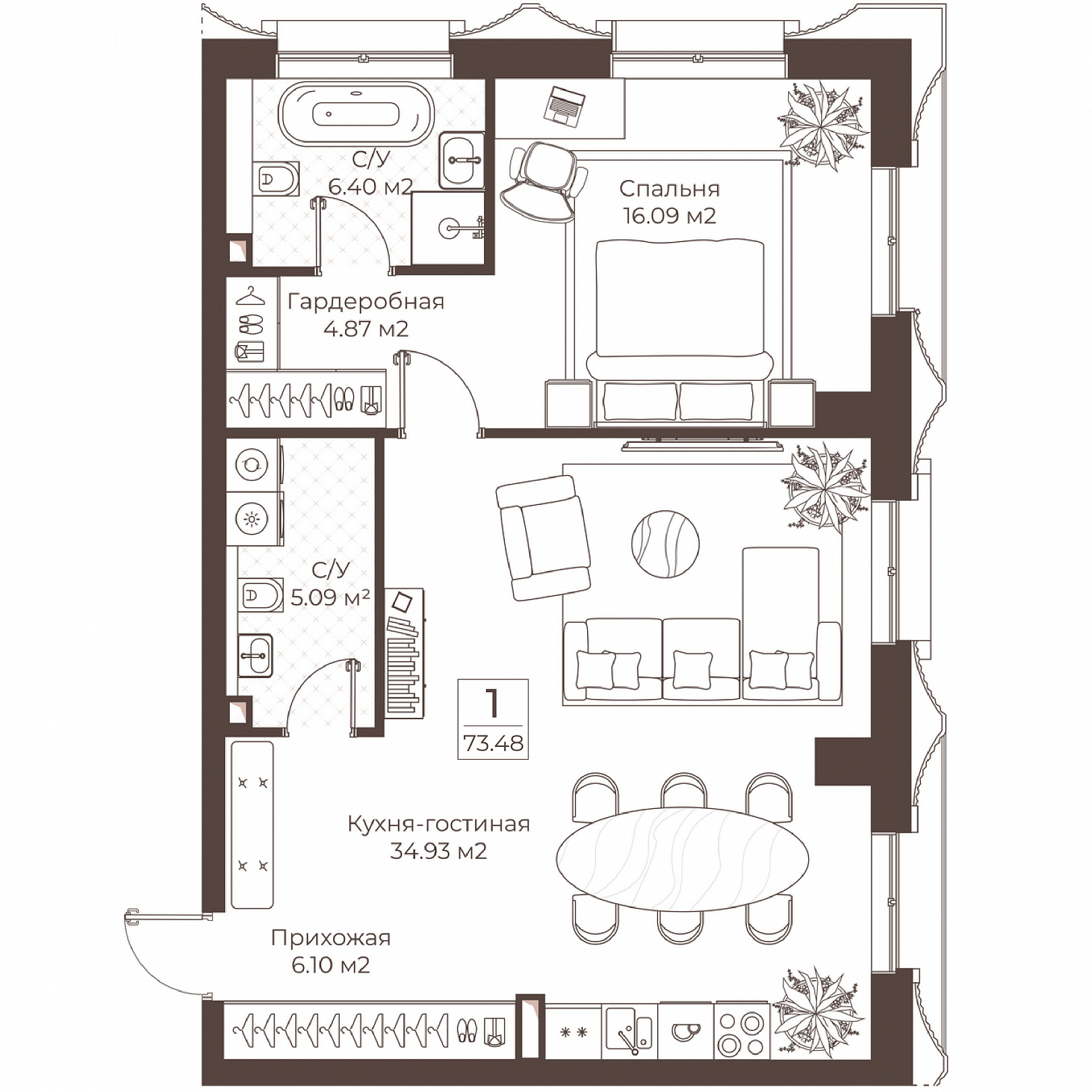 1-комнатная квартира, 73.48 м2, 4 этаж, №9, Резиденции Воронцова