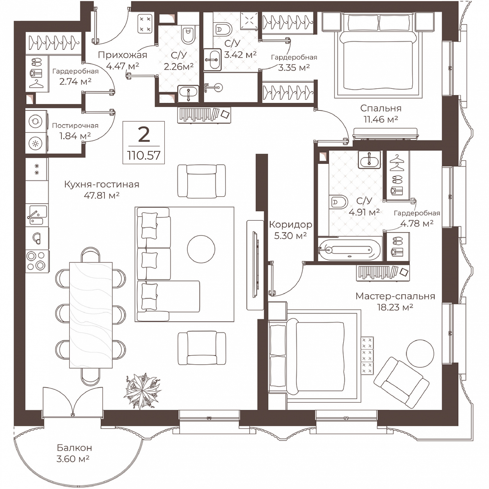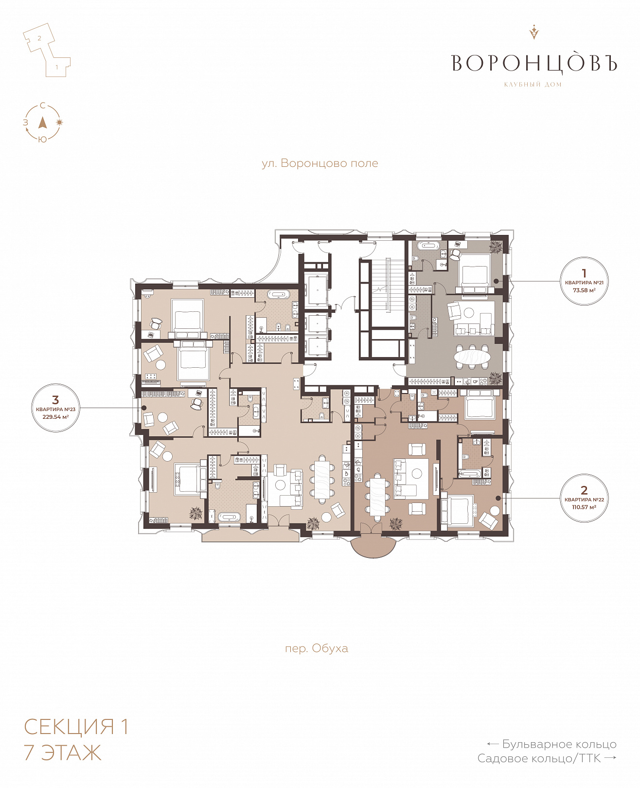 2-комнатная квартира, 110.57 м2, 7 этаж, №22, Резиденции Воронцова