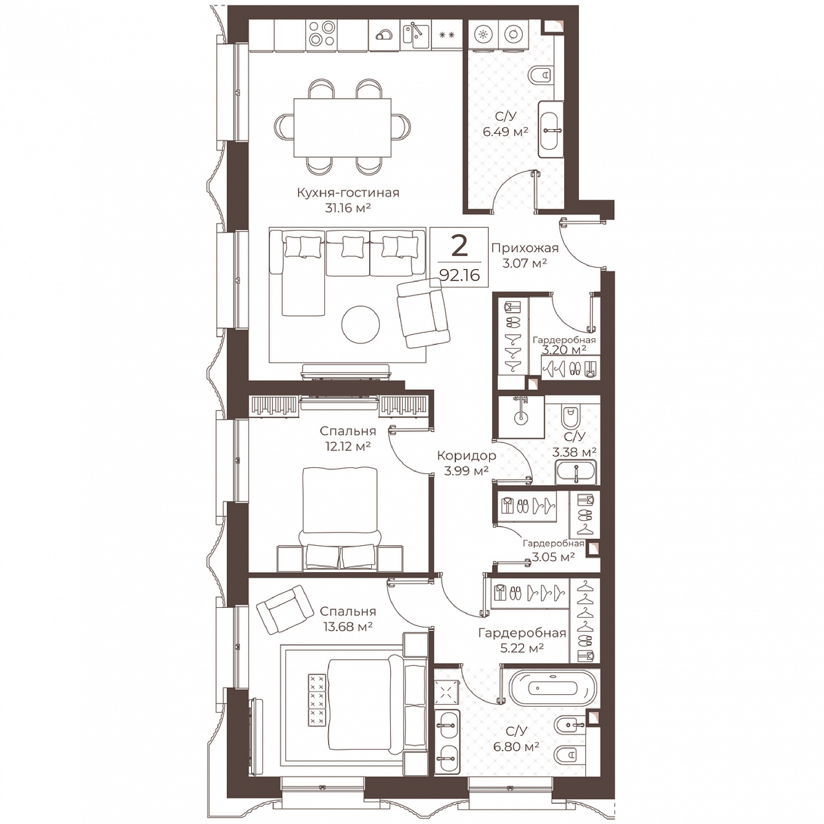 2-комнатная квартира, 92.16 м2, 2 этаж, №48, Резиденции Воронцова