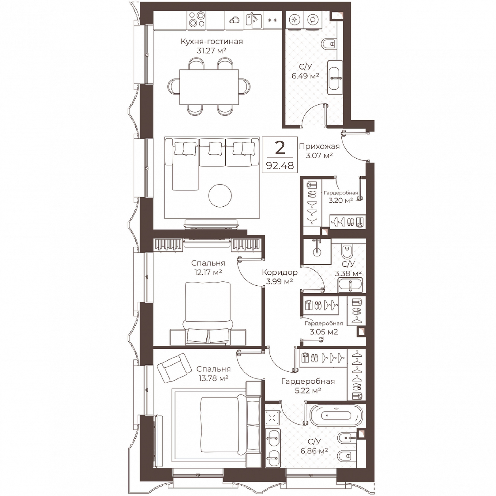2-комнатная квартира, 92.48 м2, 5 этаж, №63, Резиденции Воронцова