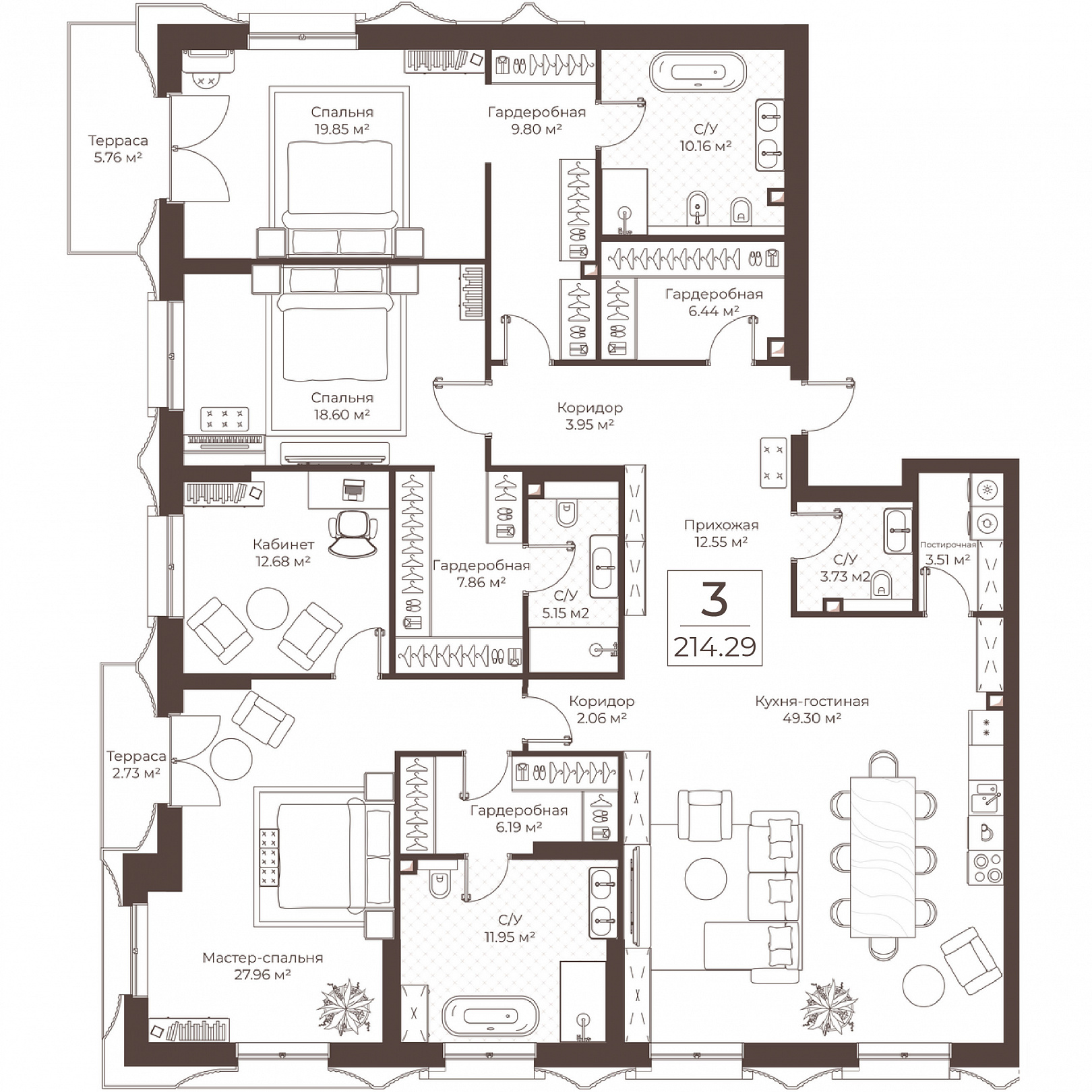 3-комнатная квартира, 214.29 м2, 12 этаж, №36, Резиденции Воронцова