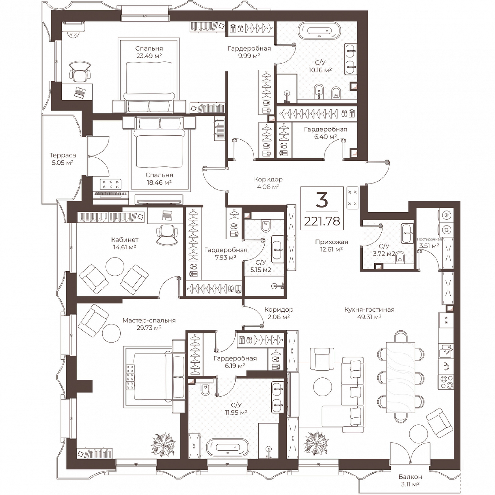 3-комнатная квартира, 221.78 м2, 10 этаж, №32, Резиденции Воронцова