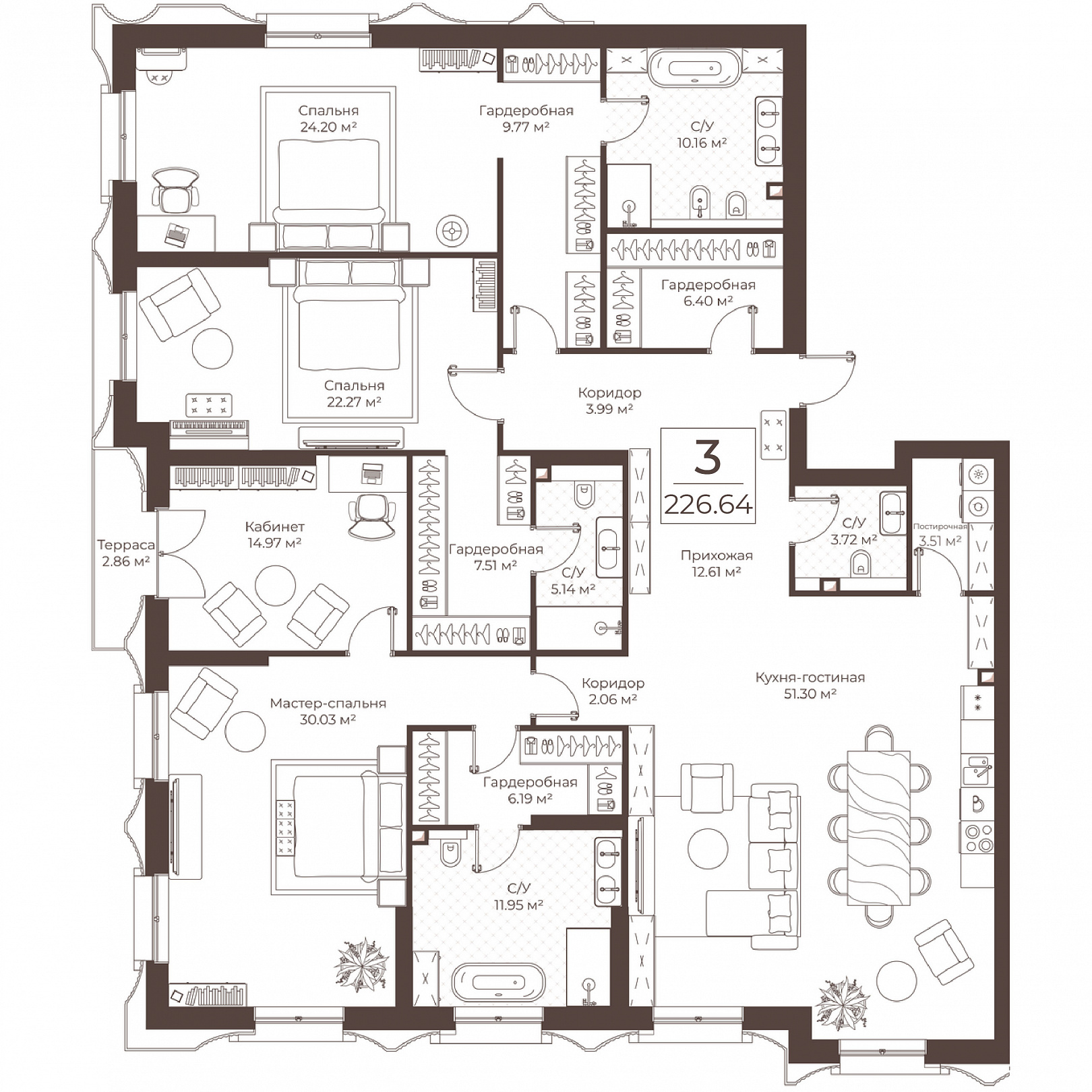 3-комнатная квартира, 226.64 м2, 8 этаж, №26, Резиденции Воронцова