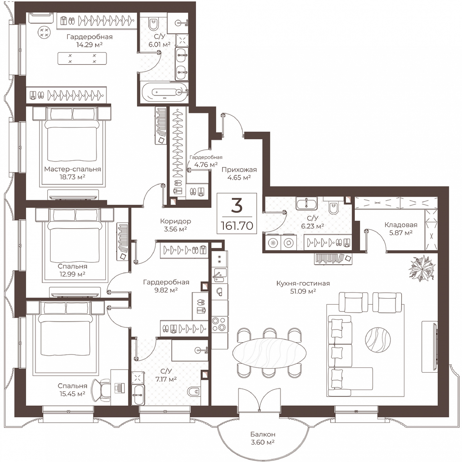 3-комнатная квартира, 161.7 м2, 6 этаж, №66, Резиденции Воронцова
